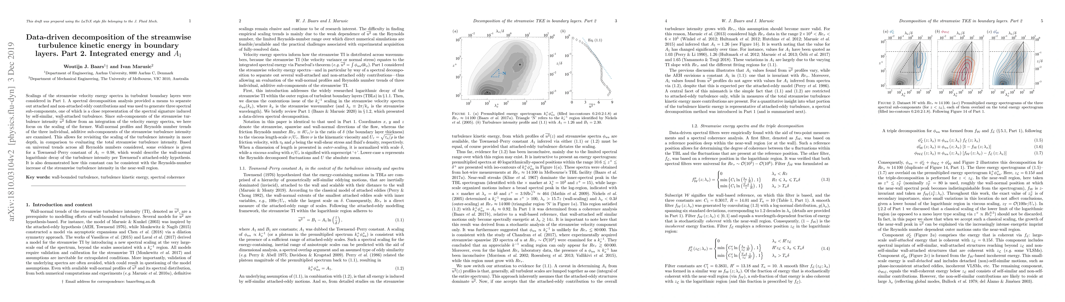 Researchers analyzed turbulence in boundary layers to develop a more detailed understanding of streamwise turbulence kinetic energy. They identified a constant, A1 = 0.98, that describes the wall-normal decay of turbulence intensity.