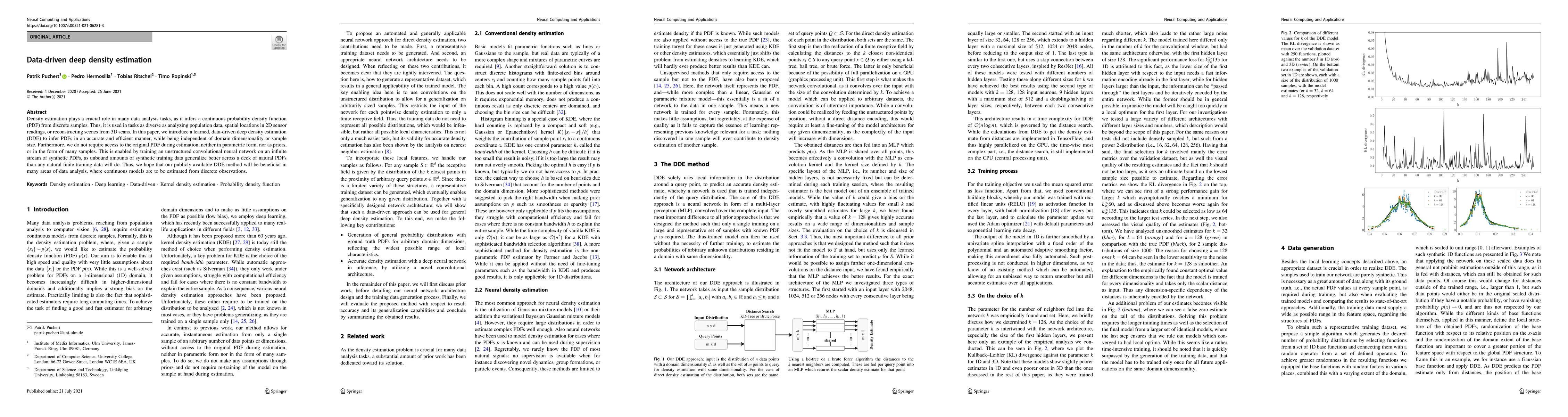 This paper introduces a data-driven deep density estimation method that can accurately estimate continuous probability density functions from discrete samples without requiring access to the original PDF. It trains an unstructured convolutional neural network on synthetic data to generalize across various natural distributions.