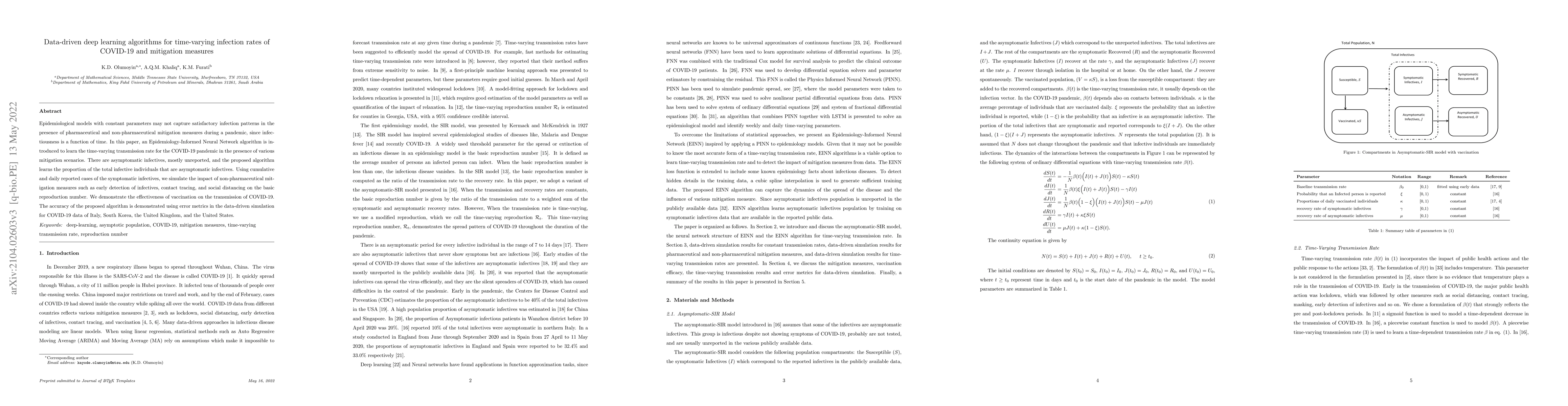 This paper introduces an Epidemiology-Informed Neural Network to model the time-varying transmission rate of COVID-19, accounting for asymptomatic cases and the impact of mitigation measures. The algorithm demonstrates effectiveness in simulating the effects of vaccination and non-pharmaceutical interventions on the basic reproduction number.