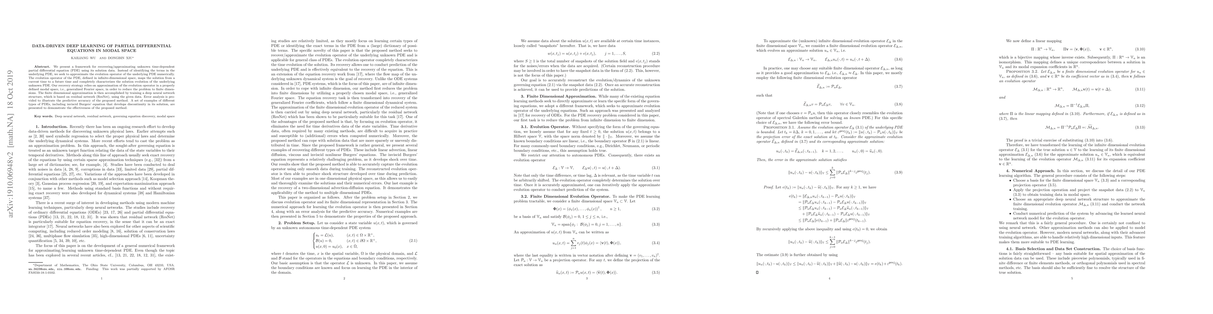 A deep learning method recovers partial differential equations from solution data by approximating the evolution operator in a modal space, reducing it to finite dimensions for training a neural network. The approach shows predictive accuracy on various PDEs, including those with discontinuous solutions.