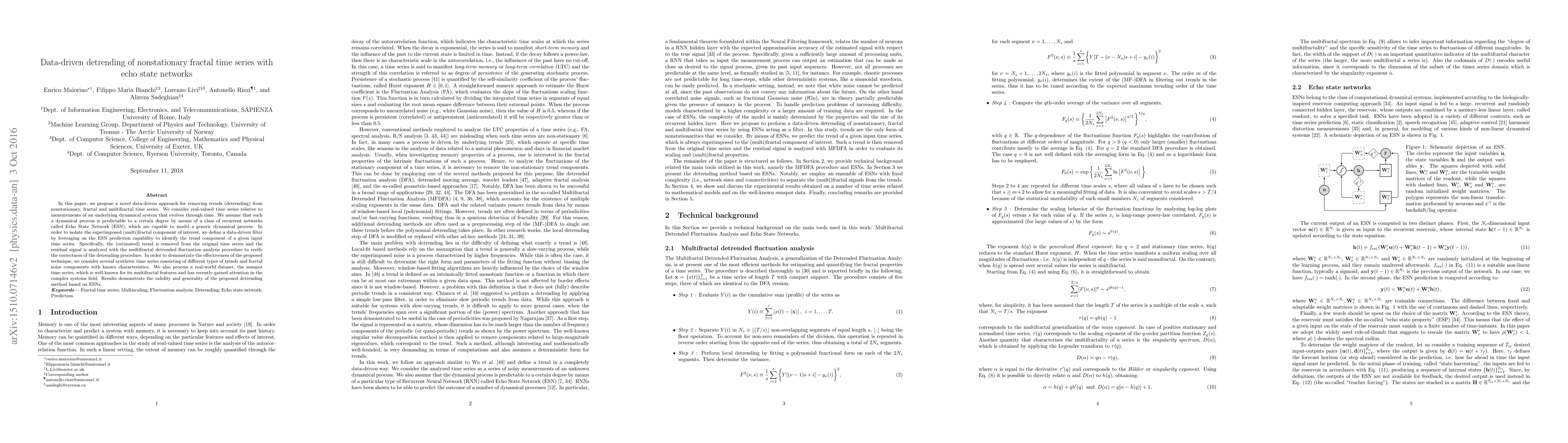 This paper proposes a novel data-driven method using Echo State Networks (ESN) to detrend nonstationary fractal time series by predicting and removing trend components. The effectiveness of the method is demonstrated through synthetic and real-world sunspot datasets.