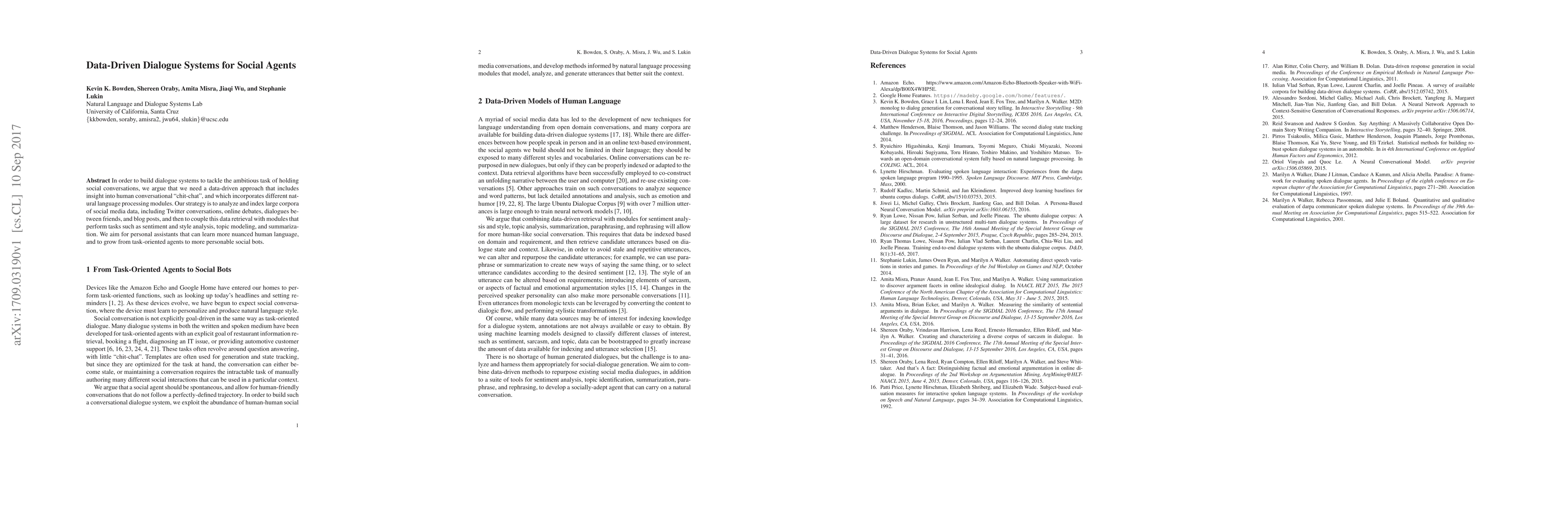 This paper proposes a data-driven approach for developing dialogue systems that enable social agents to engage in nuanced human conversations by analyzing large corpora of social media data and integrating NLP modules for sentiment, style, topic modeling, and summarization. The goal is to evolve task-oriented agents into personable social bots.