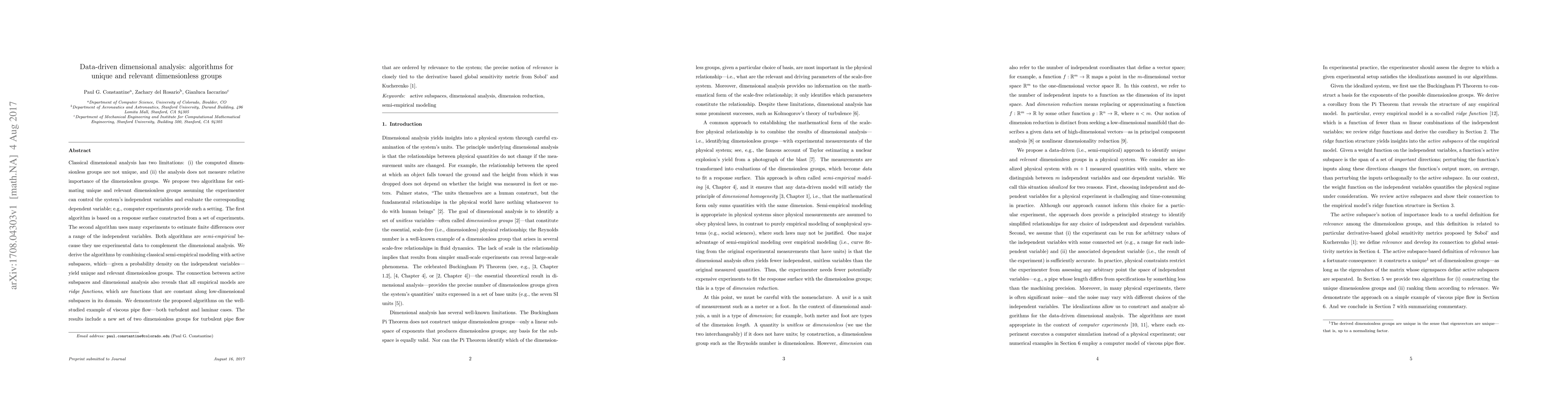 Classical dimensional analysis has two limitations: (i) the computed dimensionless groups are not unique, and (ii) the analysis does not measure relative importance of the dimensionless groups. We propose two algorithms for estimating unique and relevant dimensionless groups assuming the experimenter can control the system's independent variables and evaluate the corresponding dependent variable; e.g., computer experiments provide such a setting. The first algorithm is based on a response surface constructed from a set of experiments. The second algorithm uses many experiments to estimate finite differences over a range of the independent variables. Both algorithms are semi-empirical because they use experimental data to complement the dimensional analysis. We derive the algorithms by combining classical semi-empirical modeling with active subspaces, which---given a probability density on the independent variables---yield unique and relevant dimensionless groups. The connection between active subspaces and dimensional analysis also reveals that all empirical models are ridge functions, which are functions that are constant along low-dimensional subspaces in its domain. We demonstrate the proposed algorithms on the well-studied example of viscous pipe flow---both turbulent and laminar cases. The results include a new set of two dimensionless groups for turbulent pipe flow that are ordered by relevance to the system; the precise notion of relevance is closely tied to the derivative based global sensitivity metric from Sobol' and Kucherenko.
