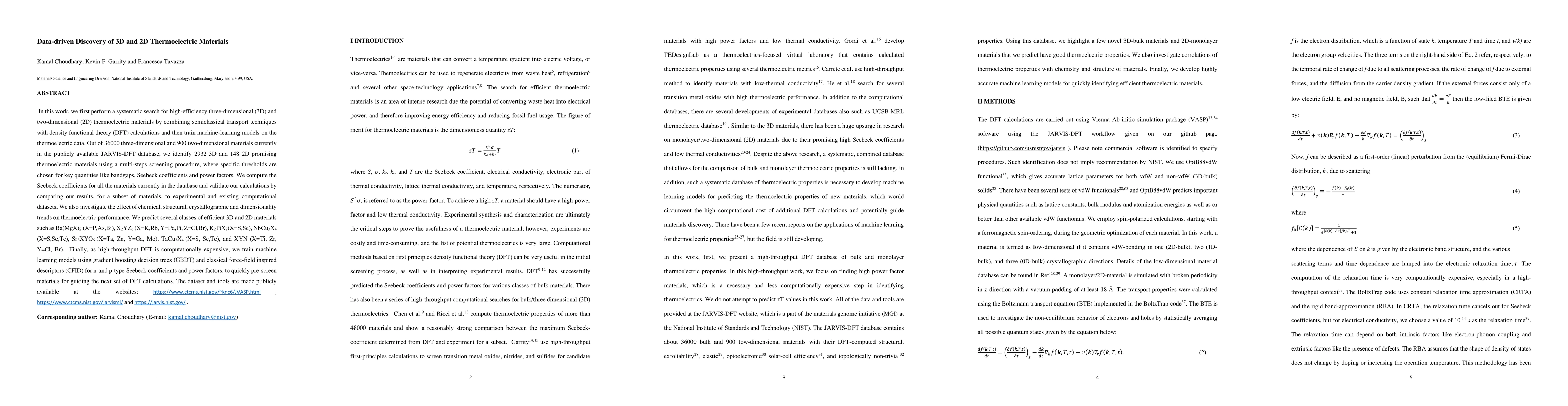 This research identifies high-efficiency thermoelectric materials using a systematic search, DFT calculations, and machine learning models. It screens 36,000 3D and 900 2D materials to discover promising thermoelectric candidates and predicts novel materials such as Ba(MgX)2 and TaCu3X4, while also developing tools for faster material screening.
