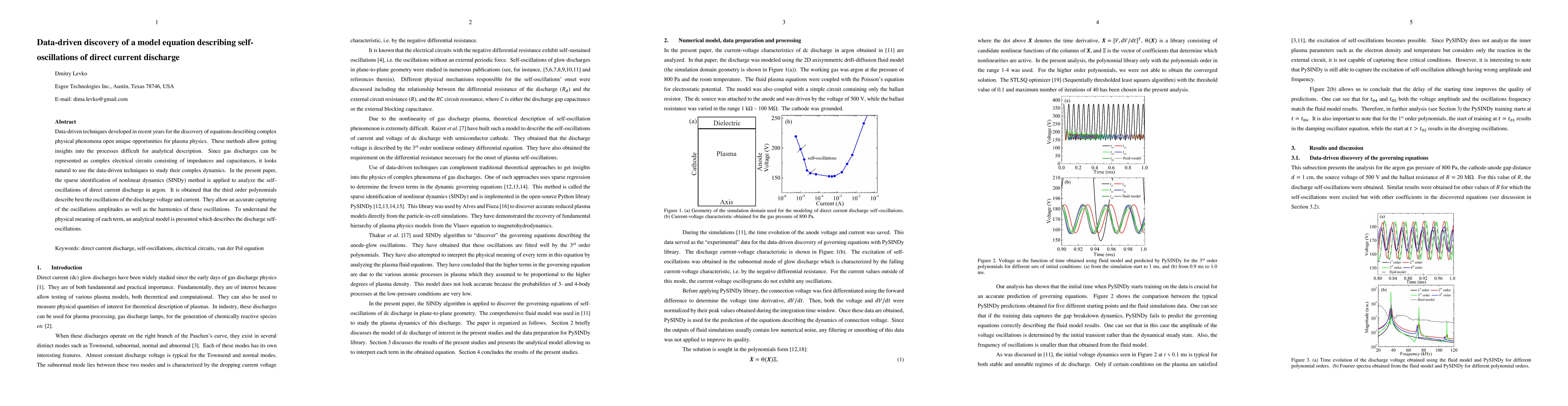 The paper employs the SINDy method to derive a data-driven model equation for the self-oscillations in direct current discharge in argon, revealing that third-order polynomials best capture the oscillations' dynamics, with an accompanying analytical model to interpret these findings physically.