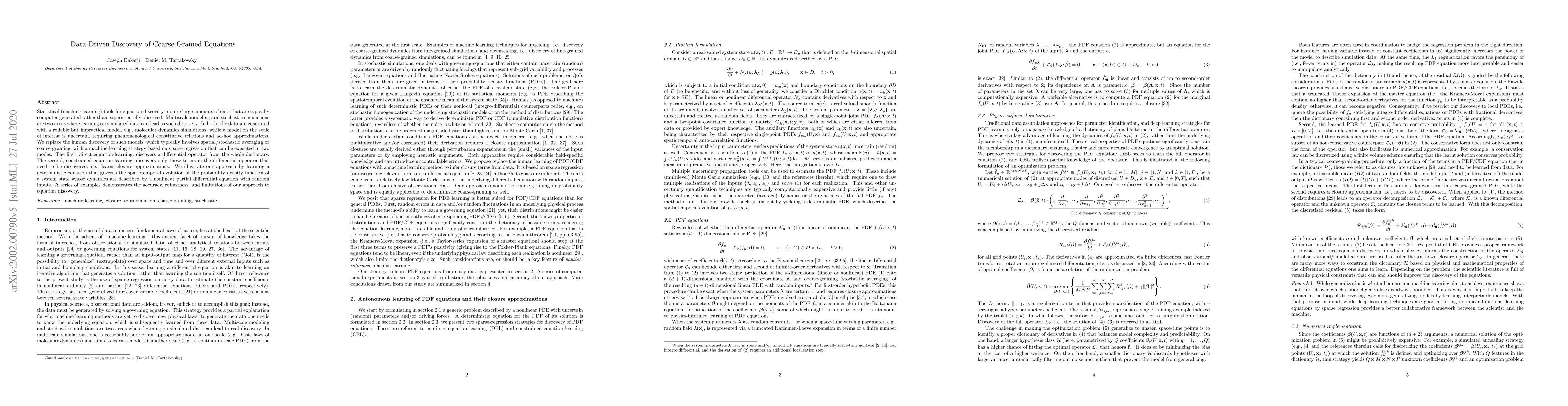 Statistical (machine learning) tools for equation discovery require large amounts of data that are typically computer generated rather than experimentally observed. Multiscale modeling and stochastic simulations are two areas where learning on simulated data can lead to such discovery. In both, the data are generated with a reliable but impractical model, e.g., molecular dynamics simulations, while a model on the scale of interest is uncertain, requiring phenomenological constitutive relations and ad-hoc approximations. We replace the human discovery of such models, which typically involves spatial/stochastic averaging or coarse-graining, with a machine-learning strategy based on sparse regression that can be executed in two modes. The first, direct equation-learning, discovers a differential operator from the whole dictionary. The second, constrained equation-learning, discovers only those terms in the differential operator that need to be discovered, i.e., learns closure approximations. We illustrate our approach by learning a deterministic equation that governs the spatiotemporal evolution of the probability density function of a system state whose dynamics are described by a nonlinear partial differential equation with random inputs. A series of examples demonstrates the accuracy, robustness, and limitations of our approach to equation discovery.