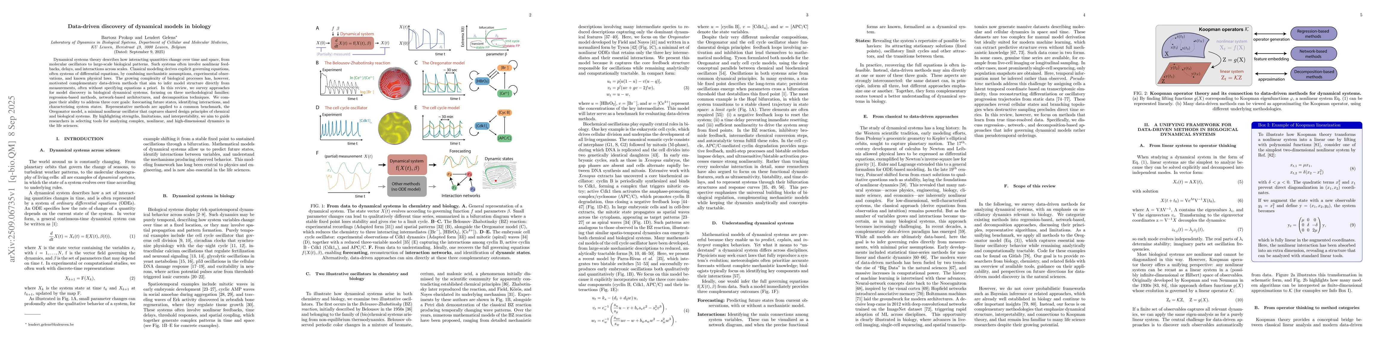 Dynamical systems theory describes how interacting quantities change over time and space, from molecular oscillators to large-scale biological patterns. Such systems often involve nonlinear feedbacks, delays, and interactions across scales. Classical modeling derives explicit governing equations, often systems of differential equations, by combining mechanistic assumptions, experimental observations, and known physical laws. The growing complexity of biological processes has, however, motivated complementary data-driven methods that aim to infer model structure directly from measurements, often without specifying equations a priori. In this review, we survey approaches for model discovery in biological dynamical systems, focusing on three methodological families: regression-based methods, network-based architectures, and decomposition techniques. We compare their ability to address three core goals: forecasting future states, identifying interactions, and characterizing system states. Representative methods are applied to a common benchmark, the Oregonator model, a minimal nonlinear oscillator that captures shared design principles of chemical and biological systems. By highlighting strengths, limitations, and interpretability, we aim to guide researchers in selecting tools for analyzing complex, nonlinear, and high-dimensional dynamics in the life sciences.