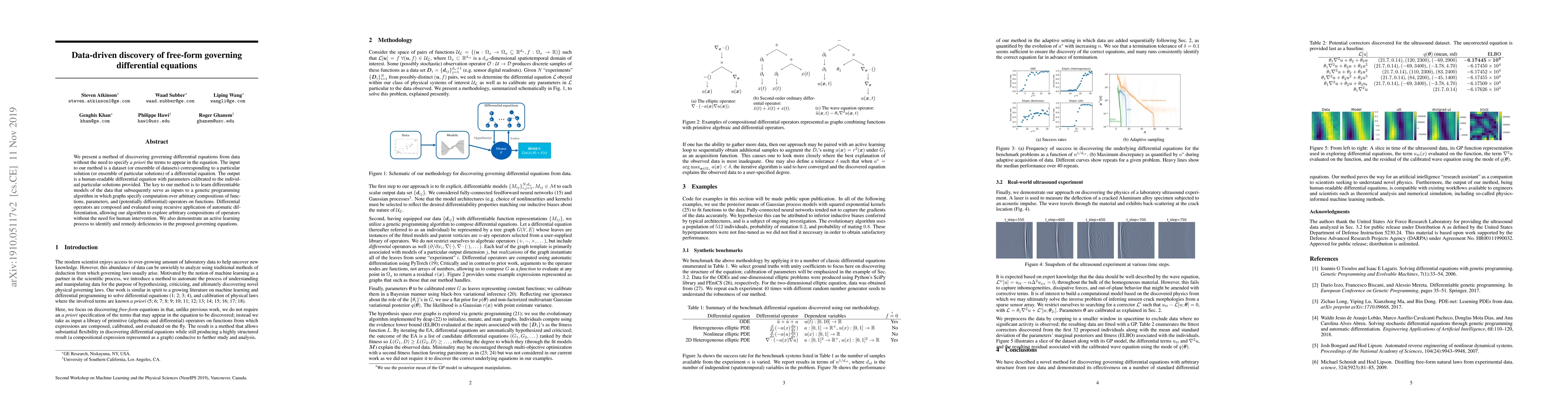 We present a method of discovering governing differential equations from data without the need to specify a priori the terms to appear in the equation. The input to our method is a dataset (or ensemble of datasets) corresponding to a particular solution (or ensemble of particular solutions) of a differential equation. The output is a human-readable differential equation with parameters calibrated to the individual particular solutions provided. The key to our method is to learn differentiable models of the data that subsequently serve as inputs to a genetic programming algorithm in which graphs specify computation over arbitrary compositions of functions, parameters, and (potentially differential) operators on functions. Differential operators are composed and evaluated using recursive application of automatic differentiation, allowing our algorithm to explore arbitrary compositions of operators without the need for human intervention. We also demonstrate an active learning process to identify and remedy deficiencies in the proposed governing equations.
