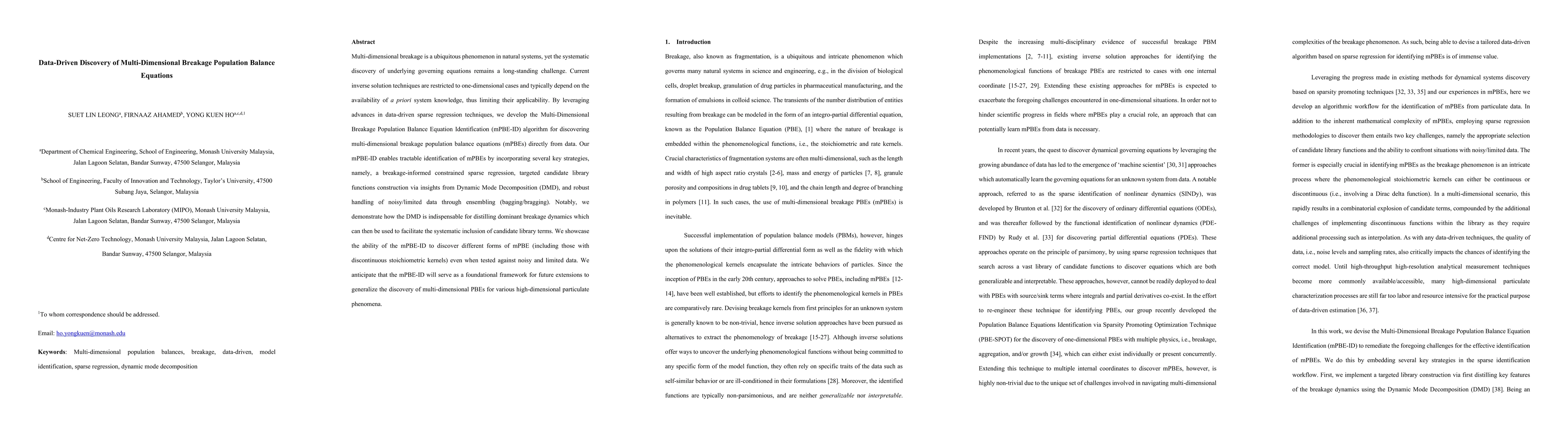 Multi-dimensional breakage is a ubiquitous phenomenon in natural systems, yet the systematic discovery of underlying governing equations remains a long-standing challenge. Current inverse solution techniques are restricted to one-dimensional cases and typically depend on the availability of a priori system knowledge, thus limiting their applicability. By leveraging advances in data-driven sparse regression techniques, we develop the Multi-Dimensional Breakage Population Balance Equation Identification (mPBE ID) algorithm for discovering multi-dimensional breakage population balance equations (mPBEs) directly from data. Our mPBE-ID enables tractable identification of mPBEs by incorporating several key strategies, namely, a breakage-informed constrained sparse regression, targeted candidate library functions construction via insights from Dynamic Mode Decomposition (DMD), and robust handling of noisy/limited data through ensembling (bagging/bragging). Notably, we demonstrate how the DMD is indispensable for distilling dominant breakage dynamics which can then be used to facilitate the systematic inclusion of candidate library terms. We showcase the ability of the mPBE-ID to discover different forms of mPBE (including those with discontinuous stoichiometric kernels) even when tested against noisy and limited data. We anticipate that the mPBE-ID will serve as a foundational framework for future extensions to generalize the discovery of multi-dimensional PBEs for various high-dimensional particulate phenomena.