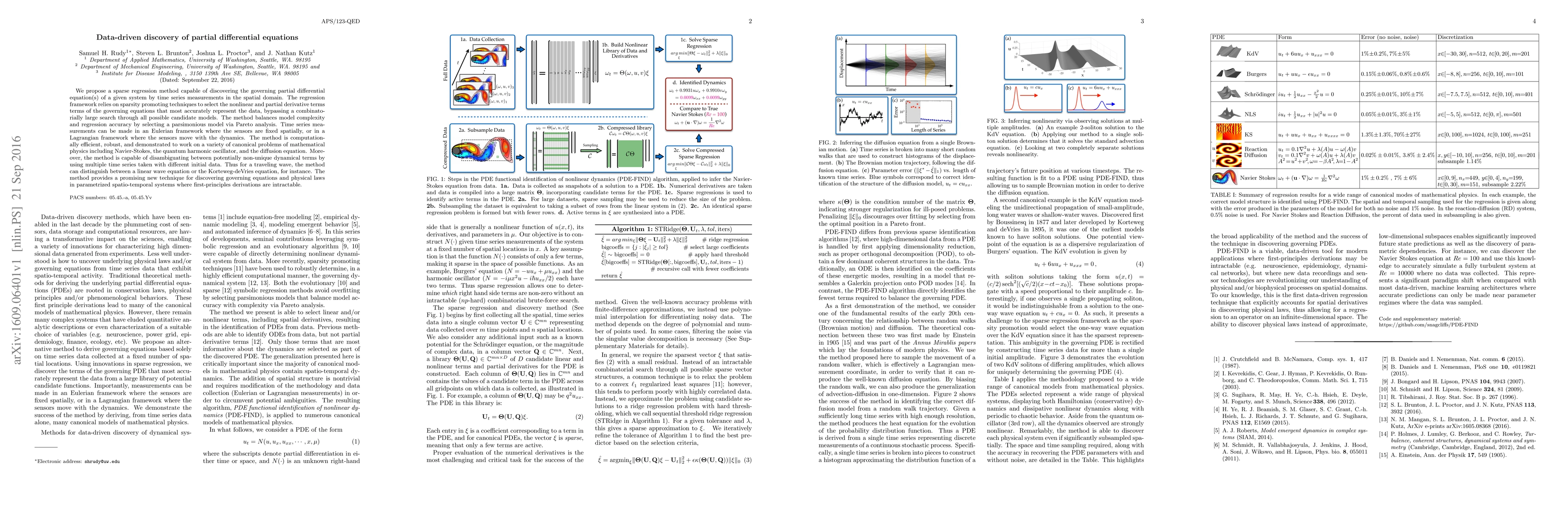 This paper proposes a sparse regression method for discovering partial differential equations from time series data by selecting the most representative nonlinear and derivative terms. The method efficiently balances model complexity and accuracy, and is demonstrated to work on various canonical problems, providing a new technique for uncovering physical laws in complex systems.