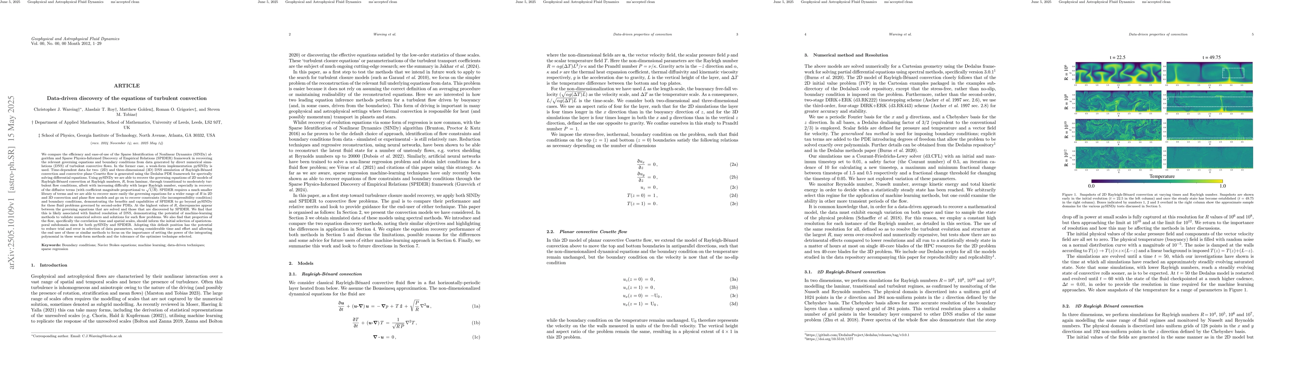 The research employs Sparse Identification of Nonlinear Dynamics (SINDy) algorithm and Sparse Physics-Informed Discovery of Empirical Relations (SPIDER) framework to recover governing equations and boundary conditions from DNS data of turbulent convective flows, using pySINDy for weak-form implementation and Dedalus PDE for generating time-dependent 2D and 3D data of Rayleigh-Benard convection and Couette flow.