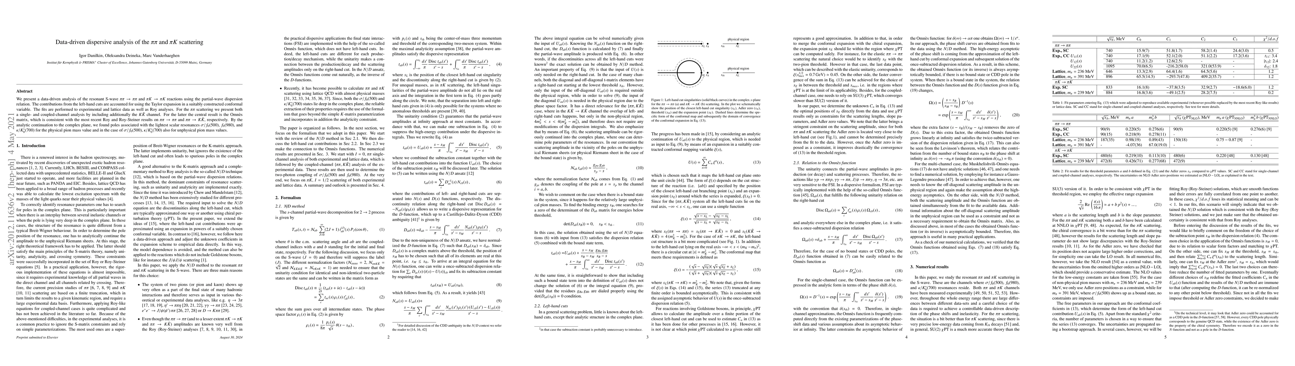 We present a data-driven analysis of the resonant S-wave $\pi\pi \to \pi\pi$ and $\pi K \to \pi K$ reactions using the partial-wave dispersion relation. The contributions from the left-hand cuts are accounted for using the Taylor expansion in a suitably constructed conformal variable. The fits are performed to experimental and lattice data as well as Roy analyses. For the $\pi\pi$ scattering we present both a single- and coupled-channel analysis by including additionally the $K\bar{K}$ channel. For the latter the central result is the Omn\`es matrix, which is consistent with the most recent Roy and Roy-Steiner results on $\pi\pi \to \pi\pi$ and $\pi\pi \to K\bar{K}$, respectively. By the analytic continuation to the complex plane, we found poles associated with the lightest scalar resonances $\sigma/f_0(500)$, $f_0(980)$, and $\kappa/K_0^*(700)$ for the physical pion mass value and in the case of $\sigma/f_0(500)$, $\kappa/K_0^*(700)$ also for unphysical pion mass values.