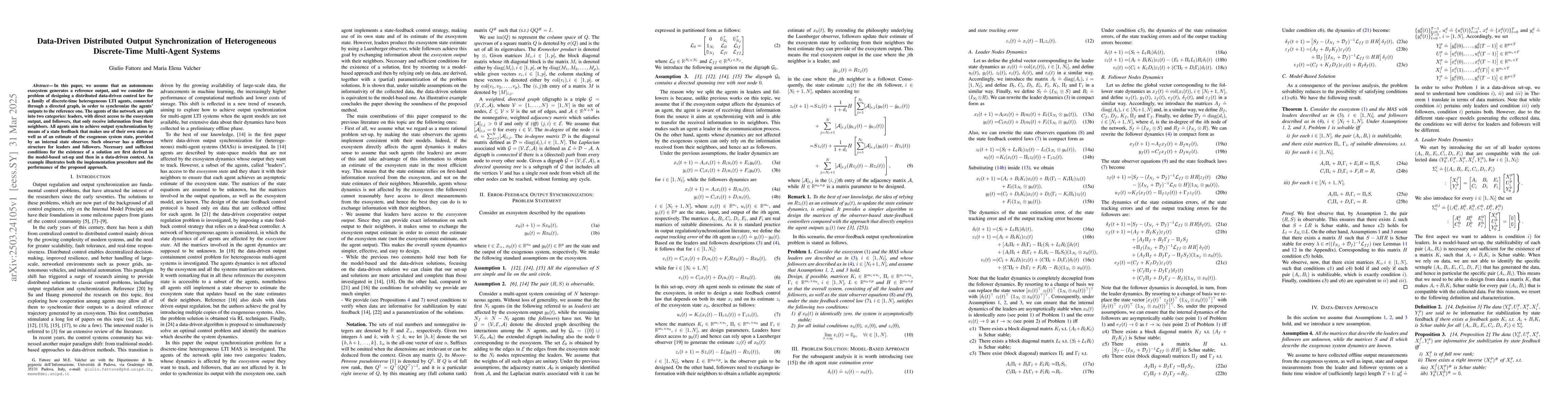 Researchers developed a method to synchronize outputs of heterogeneous discrete-time multi-agent systems using data-driven control laws. They created necessary conditions for the existence of solutions in both model-based and data-driven contexts.