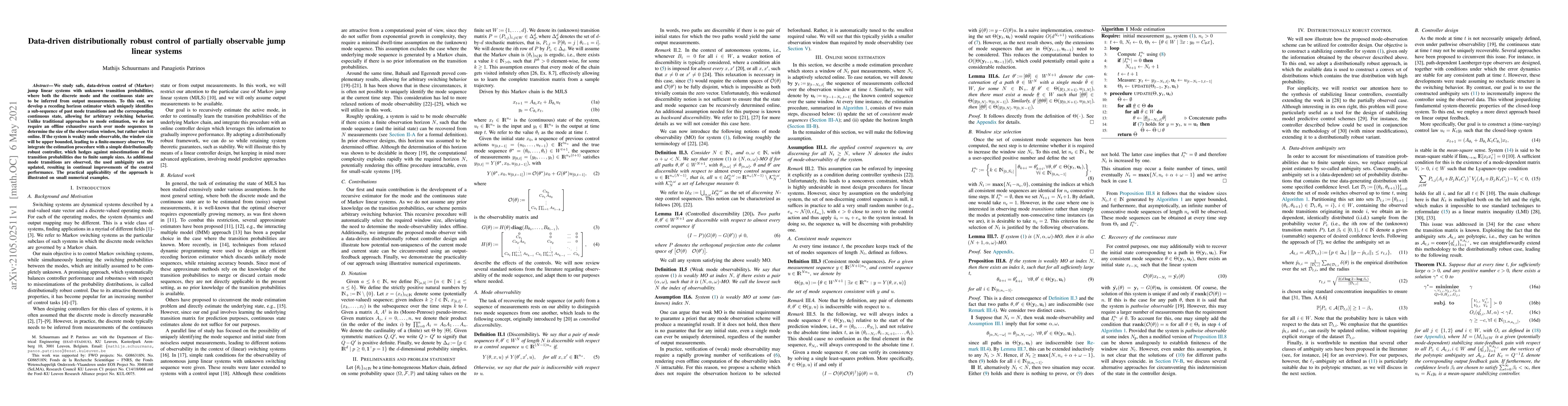 We study safe, data-driven control of (Markov) jump linear systems with unknown transition probabilities, where both the discrete mode and the continuous state are to be inferred from output measurements. To this end, we develop a receding horizon estimator which uniquely identifies a sub-sequence of past mode transitions and the corresponding continuous state, allowing for arbitrary switching behavior. Unlike traditional approaches to mode estimation, we do not require an offline exhaustive search over mode sequences to determine the size of the observation window, but rather select it online. If the system is weakly mode observable, the window size will be upper bounded, leading to a finite-memory observer. We integrate the estimation procedure with a simple distributionally robust controller, which hedges against misestimations of the transition probabilities due to finite sample sizes. As additional mode transitions are observed, the used ambiguity sets are updated, resulting in continual improvements of the control performance. The practical applicability of the approach is illustrated on small numerical examples.