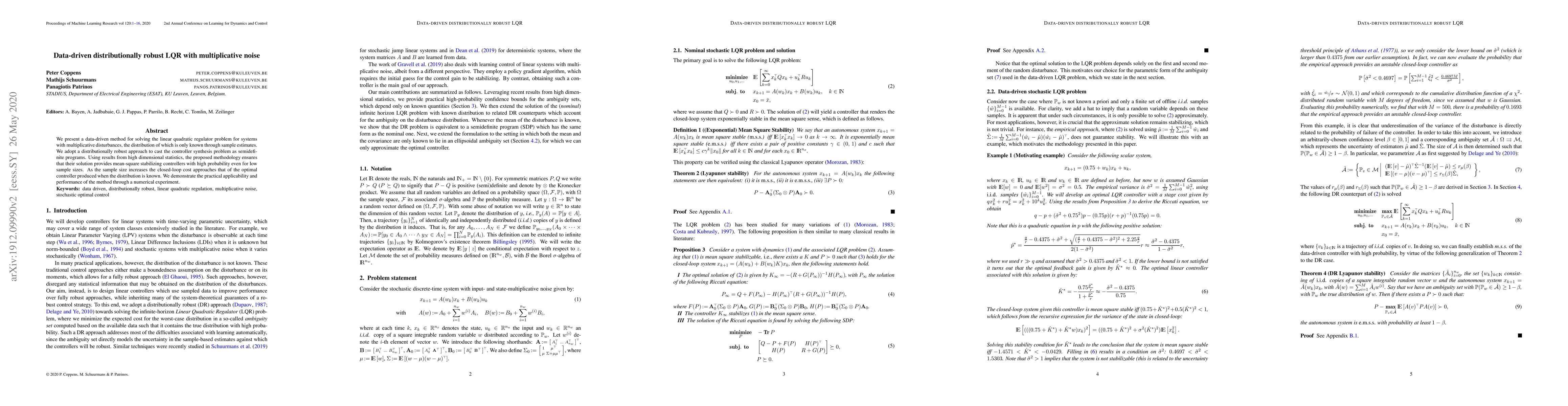 This paper proposes a data-driven method for solving the LQR problem under multiplicative disturbances using a distributionally robust approach, formulated as semidefinite programs. The method ensures mean-square stabilizing controllers with high probability, even with small sample sizes, and approaches the optimal cost as sample size increases, demonstrated through numerical experiments.