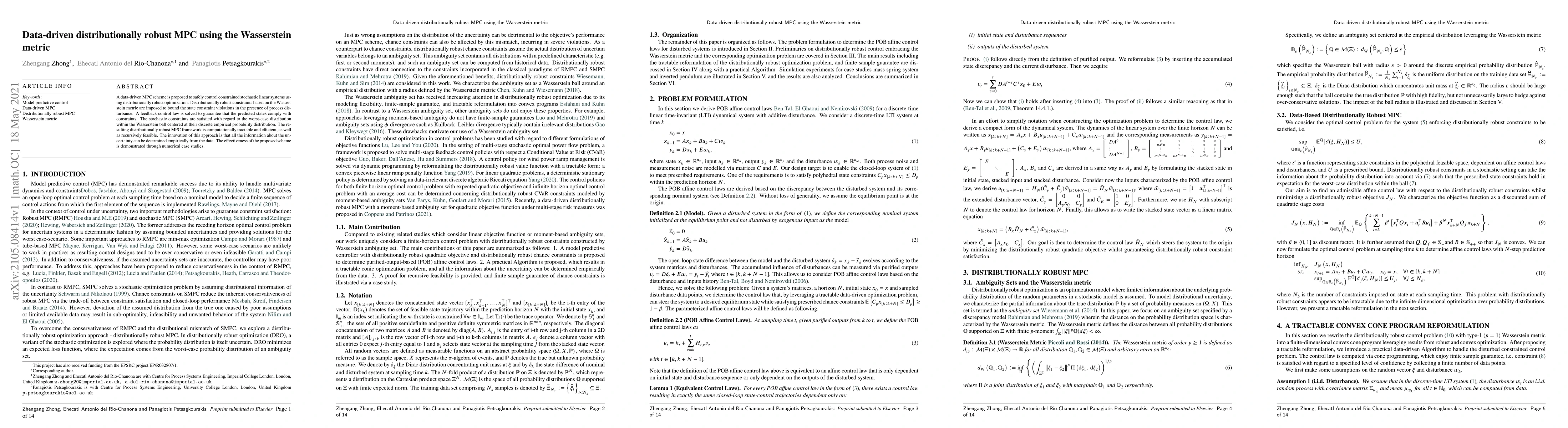 This paper proposes a data-driven model predictive control (MPC) scheme for stochastic linear systems, utilizing distributionally robust optimization with Wasserstein metric constraints to ensure safety against process disturbances. The approach is computationally efficient and empirically determines uncertainty from data, validated through numerical case studies.