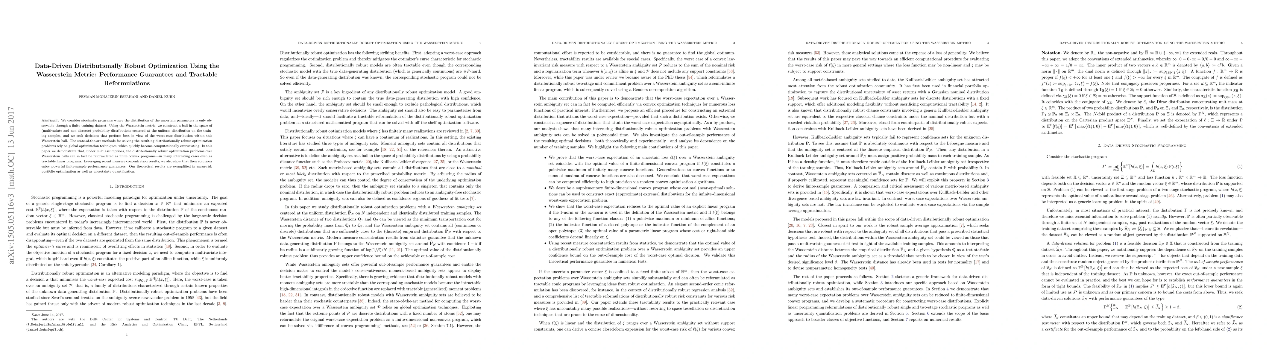 This paper reformulates distributionally robust optimization problems using the Wasserstein metric into tractable convex programs, even linear programs in some cases, and provides performance guarantees based on measure concentration. The approach is demonstrated through applications in mean-risk portfolio optimization and uncertainty quantification.