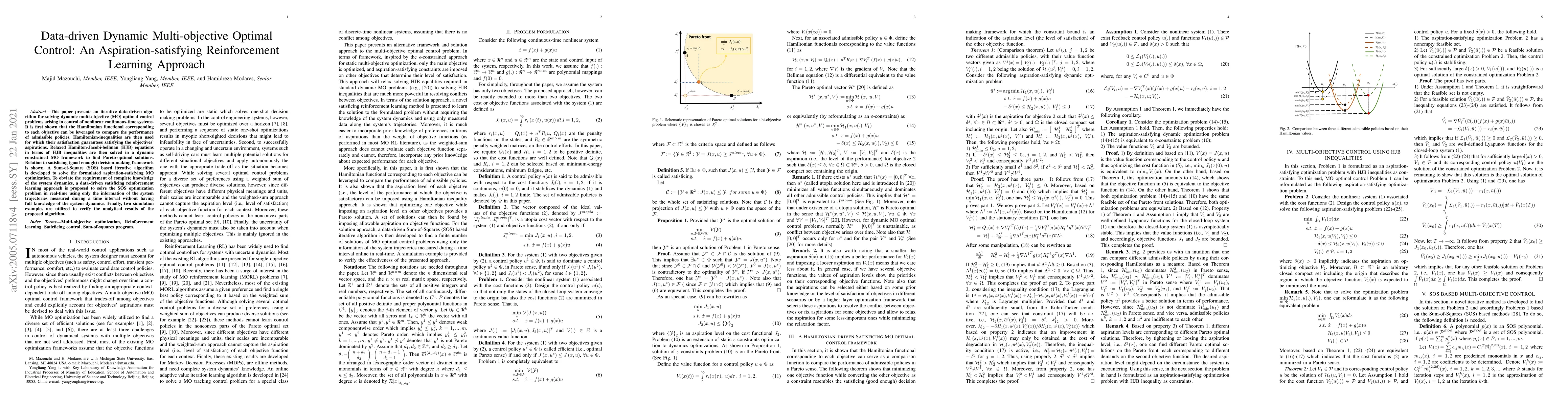 This paper introduces a data-driven iterative algorithm for solving dynamic multi-objective optimal control problems using reinforcement learning. It leverages Hamiltonian-inequalities to ensure aspiration satisfaction, and employs a Sum-of-Squares method to solve the optimization problem in real-time without requiring complete system dynamics knowledge.