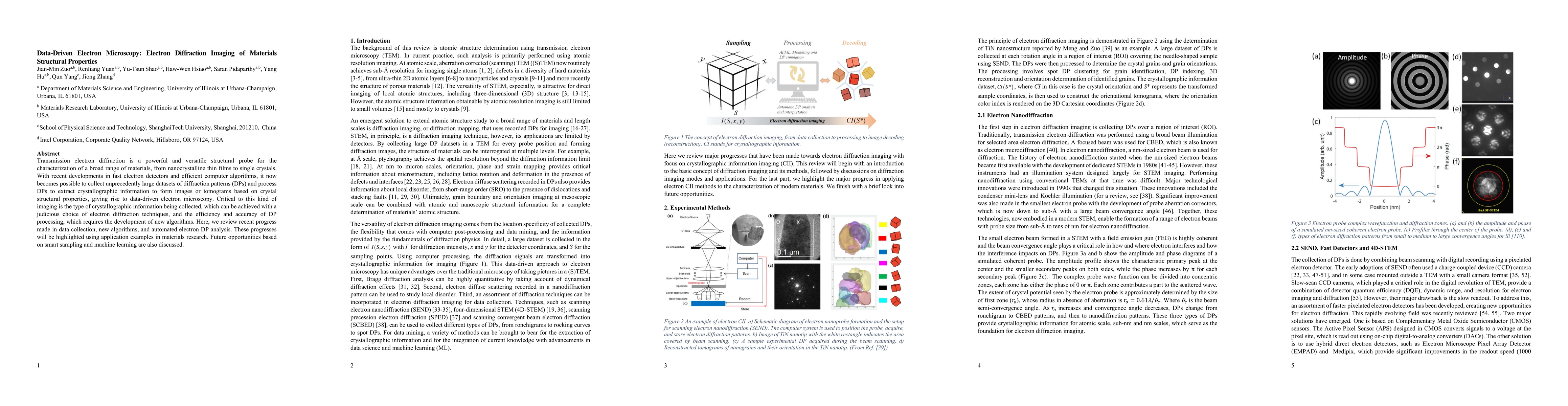 Transmission electron diffraction is a powerful and versatile structural probe for the characterization of a broad range of materials, from nanocrystalline thin films to single crystals. With recent developments in fast electron detectors and efficient computer algorithms, it now becomes possible to collect unprecedently large datasets of diffraction patterns (DPs) and process DPs to extract crystallographic information to form images or tomograms based on crystal structural properties, giving rise to data-driven electron microscopy. Critical to this kind of imaging is the type of crystallographic information being collected, which can be achieved with a judicious choice of electron diffraction techniques, and the efficiency and accuracy of DP processing, which requires the development of new algorithms. Here, we review recent progress made in data collection, new algorithms, and automated electron DP analysis. These progresses will be highlighted using application examples in materials research. Future opportunities based on smart sampling and machine learning are also discussed.