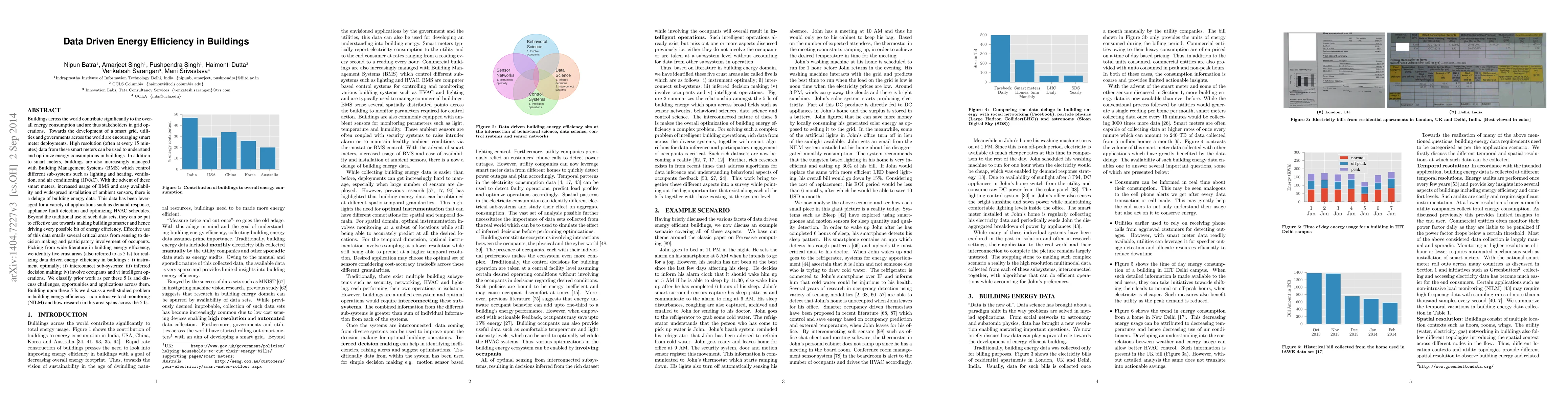 Buildings across the world contribute significantly to the overall energy consumption and are thus stakeholders in grid operations. Towards the development of a smart grid, utilities and governments across the world are encouraging smart meter deployments. High resolution (often at every 15 minutes) data from these smart meters can be used to understand and optimize energy consumptions in buildings. In addition to smart meters, buildings are also increasingly managed with Building Management Systems (BMS) which control different sub-systems such as lighting and heating, ventilation, and air conditioning (HVAC). With the advent of these smart meters, increased usage of BMS and easy availability and widespread installation of ambient sensors, there is a deluge of building energy data. This data has been leveraged for a variety of applications such as demand response, appliance fault detection and optimizing HVAC schedules. Beyond the traditional use of such data sets, they can be put to effective use towards making buildings smarter and hence driving every possible bit of energy efficiency. Effective use of this data entails several critical areas from sensing to decision making and participatory involvement of occupants. Picking from wide literature in building energy efficiency, we identify five crust areas (also referred to as 5 Is) for realizing data driven energy efficiency in buildings : i) instrument optimally; ii) interconnect sub-systems; iii) inferred decision making; iv) involve occupants and v) intelligent operations. We classify prior work as per these 5 Is and dis-cuss challenges, opportunities and applications across them. Building upon these 5 Is we discuss a well studied problem in building energy efficiency -non-intrusive load monitoring (NILM) and how research in this area spans across the 5 Is.