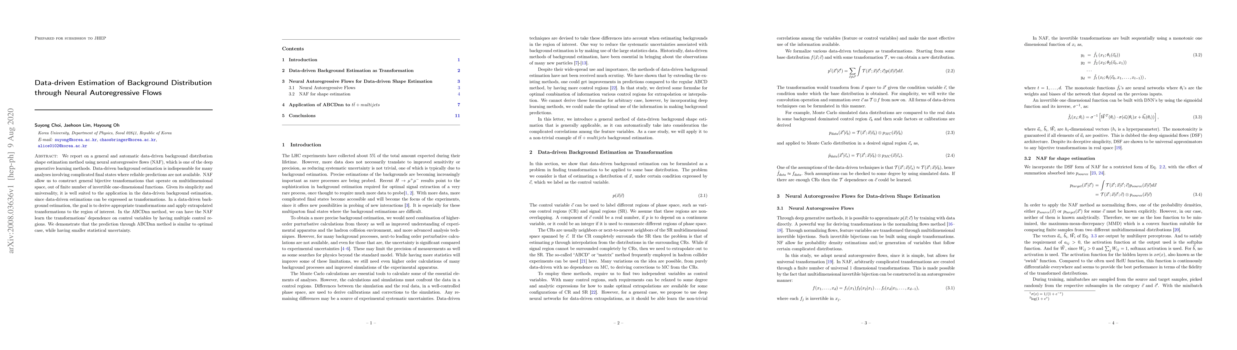 We report on a general and automatic data-driven background distribution shape estimation method using neural autoregressive flows (NAF), which is one of the deep generative learning methods. Data-driven background estimation is indispensable for many analyses involving complicated final states where reliable predictions are not available. NAF allow us to construct general bijective transformations that operate on multidimensional space, out of finite number of invertible one-dimensional functions. Given its simplicity and universality, it is well suited to the application in the data-driven background estimation, since data-driven estimations can be expressed as transformations. In a data-driven background estimation, the goal is to derive appropriate transformations and apply extrapolated transformations to the region of interest. In the ABCDnn method, we can have the NAF learn the transformations' dependence on control variables by having multiple control regions. We demonstrate that the prediction through ABCDnn method is similar to optimal case, while having smaller statistical uncertainty.