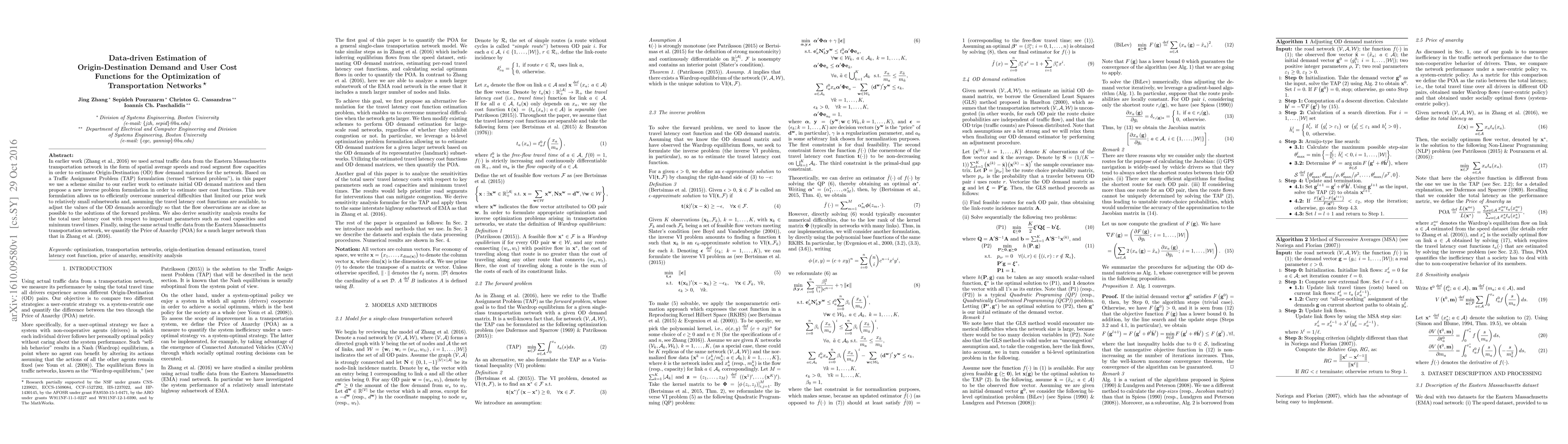 This paper estimates origin-destination demand matrices for transportation networks using actual traffic data, and introduces a new method to estimate user cost functions. It also calculates the Price of Anarchy for larger networks than previous studies.