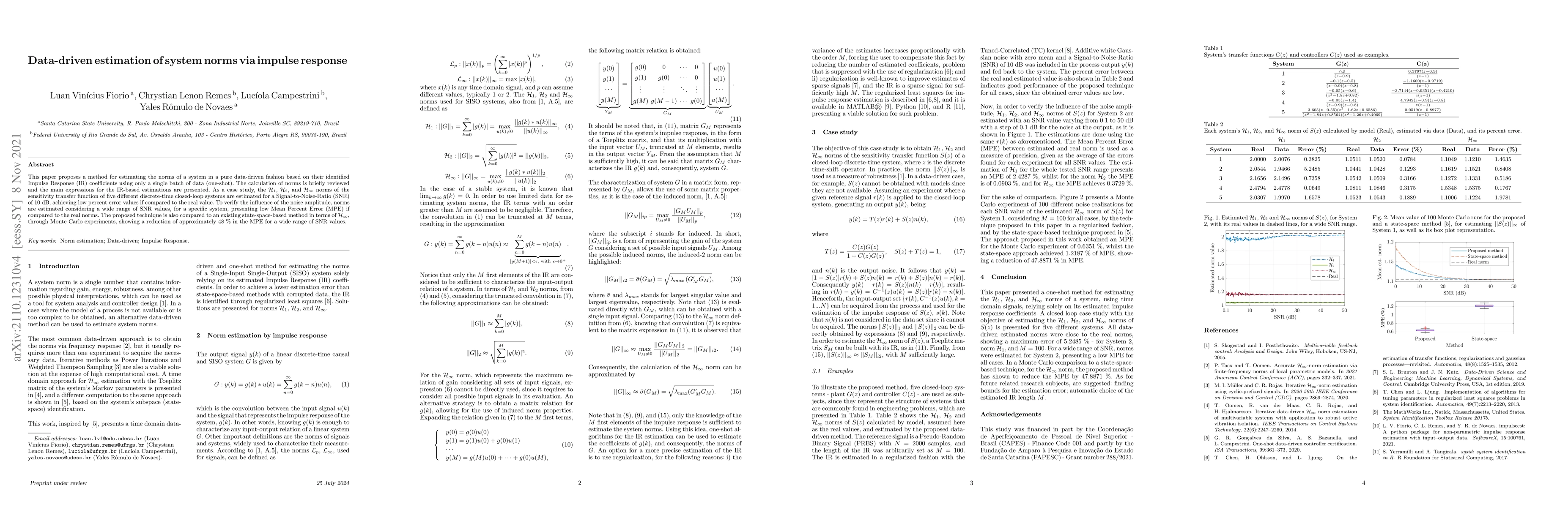 This paper proposes a data-driven method to estimate system norms based on impulse response coefficients, achieving low percent error values compared to real values in various signal-to-noise ratio scenarios.