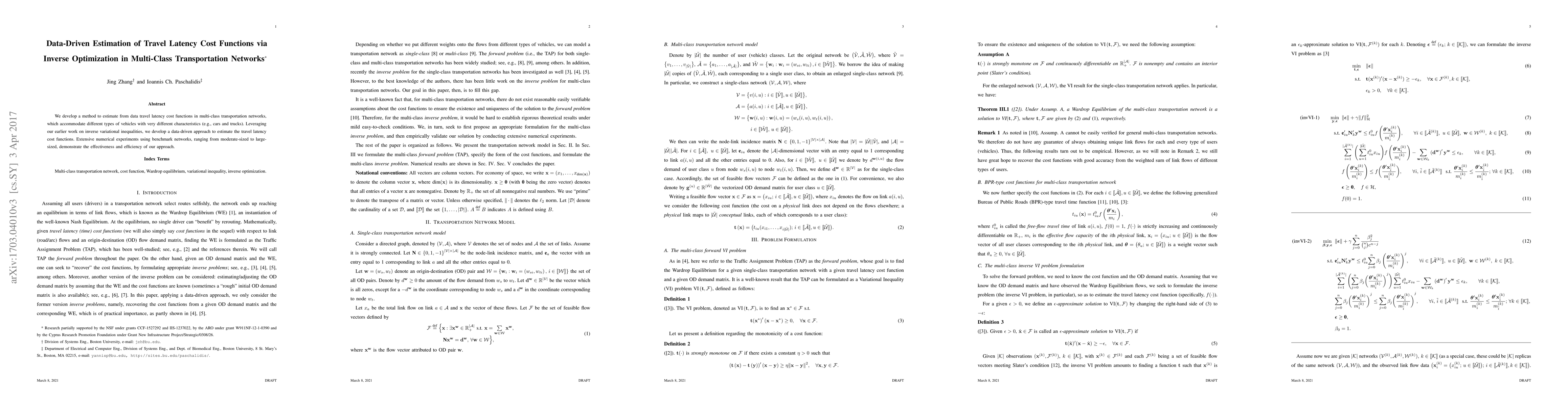 Researchers develop a method to estimate travel latency cost functions in multi-class transportation networks using data-driven inverse optimization. Their approach effectively models different vehicle types and demonstrates high efficiency on various network sizes.