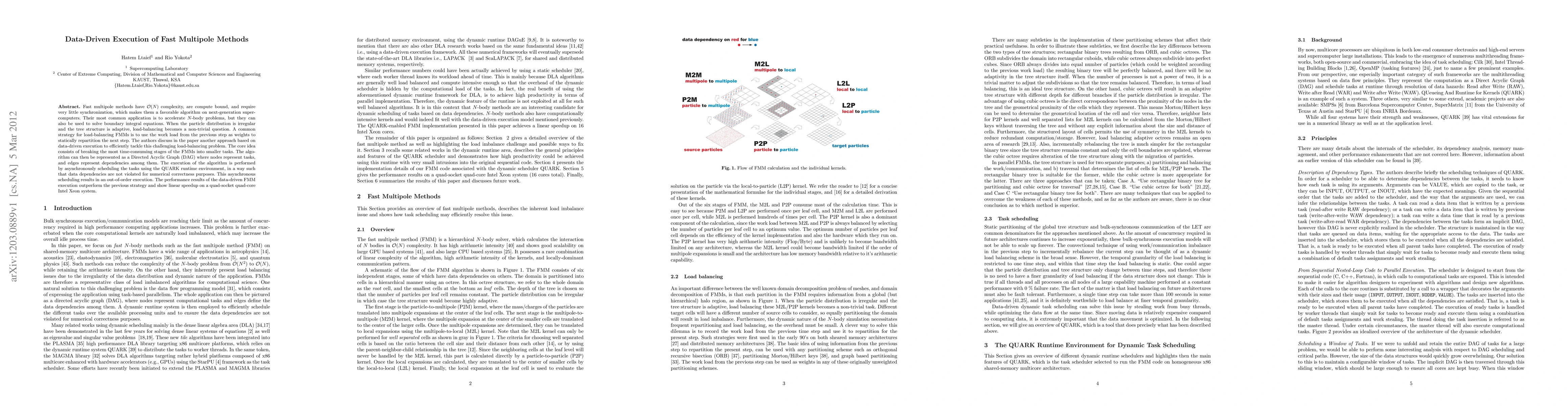 This research introduces a data-driven approach to execute Fast Multipole Methods (FMMs) for load-balancing in N-body problems and boundary integral equations. The method breaks down FMM stages into tasks, represented as a Directed Acyclic Graph (DAG), and uses asynchronous scheduling via QUARK runtime for out-of-order execution, ensuring data dependencies are respected. The new strategy outperforms traditional load-balancing methods, demonstrating linear speedup on a quad-socket quad-core Intel Xeon system.