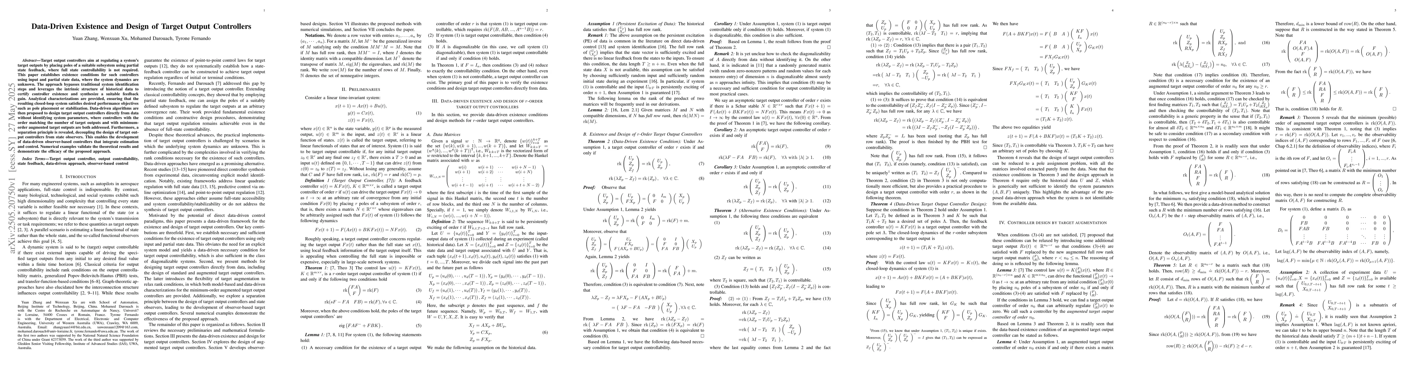 The paper establishes existence conditions for target output controllers using input and partial state data, bypassing traditional system identification steps. It leverages historical data's intrinsic structure to certify controller existence and synthesize feedback gains, providing analytical characterizations for desired performance objectives.