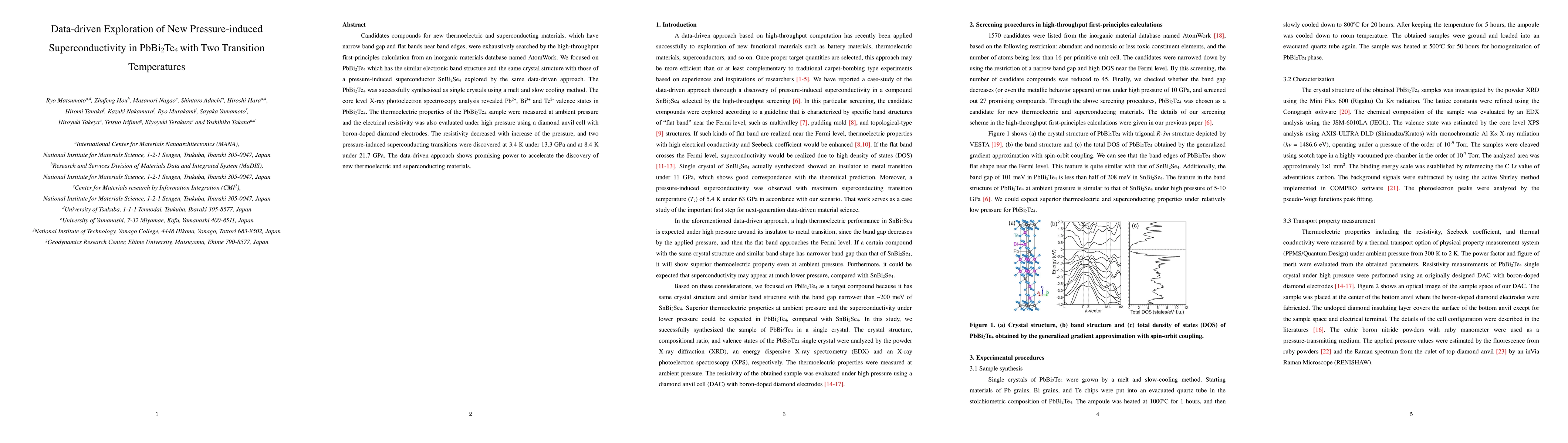 Candidates compounds for new thermoelectric and superconducting materials, which have narrow band gap and flat bands near band edges, were exhaustively searched by the high-throughput first-principles calculation from an inorganic materials database named AtomWork. We focused on PbBi$_2$Te$_4$ which has the similar electronic band structure and the same crystal structure with those of a pressure-induced superconductor SnBi2Se4 explored by the same data-driven approach. The PbBi$_2$Te$_4$ was successfully synthesized as single crystals using a melt and slow cooling method. The core level X-ray photoelectron spectroscopy analysis revealed Pb2+, Bi3+ and Te2- valence states in PbBi$_2$Te$_4$. The thermoelectric properties of the PbBi$_2$Te$_4$ sample were measured at ambient pressure and the electrical resistivity was also evaluated under high pressure using a diamond anvil cell with boron-doped diamond electrodes. The resistivity decreased with increase of the pressure, and two pressure-induced superconducting transitions were discovered at 3.4 K under 13.3 GPa and at 8.4 K under 21.7 GPa. The data-driven approach shows promising power to accelerate the discovery of new thermoelectric and superconducting materials.