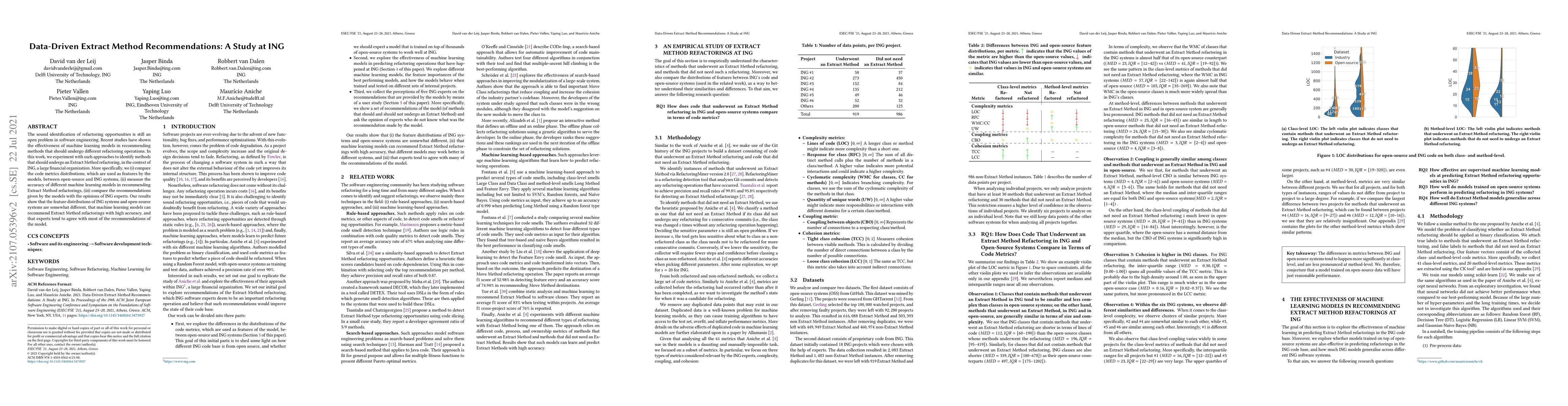 This study explores machine learning models to recommend Extract Method refactorings within ING, comparing code metrics distributions between ING and open-source systems, and evaluating the accuracy of various models. The findings indicate that machine learning can recommend refactorings effectively, with expert opinions largely aligning with model recommendations.