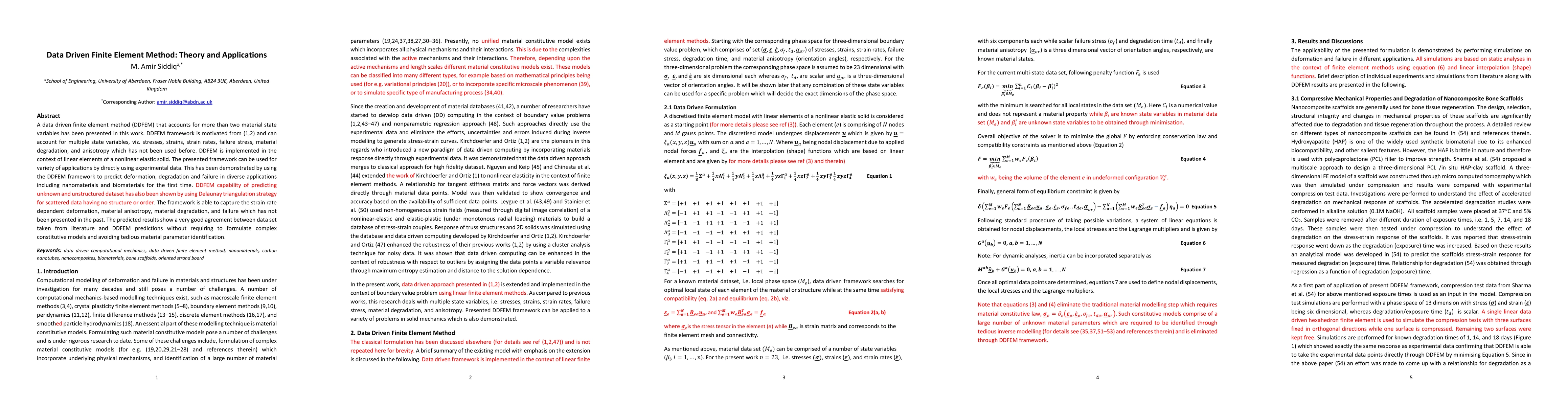 A data driven finite element method (DDFEM) that accounts for more than two material state variables has been presented in this work. DDFEM framework is motivated from (1,2) and can account for multiple state variables, viz. stresses, strains, strain rates, failure stress, material degradation, and anisotropy which has not been used before. DDFEM is implemented in the context of linear elements of a nonlinear elastic solid. The presented framework can be used for variety of applications by directly using experimental data. This has been demonstrated by using the DDFEM framework to predict deformation, degradation and failure in diverse applications including nanomaterials and biomaterials for the first time. DDFEM capability of predicting unknown and unstructured dataset has also been shown by using Delaunay triangulation strategy for scattered data having no structure or order. The framework is able to capture the strain rate dependent deformation, material anisotropy, material degradation, and failure which has not been presented in the past. The predicted results show a very good agreement between data set taken from literature and DDFEM predictions without requiring to formulate complex constitutive models and avoiding tedious material parameter identification.