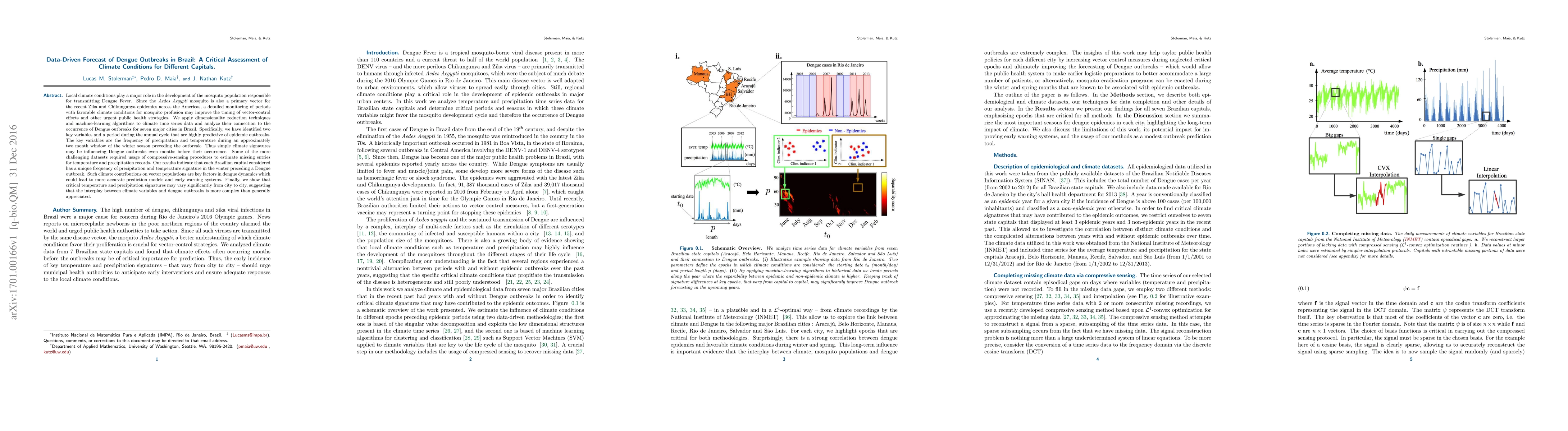 Local climate conditions play a major role in the development of the mosquito population responsible for transmitting Dengue Fever. Since the {\em Aedes Aegypti} mosquito is also a primary vector for the recent Zika and Chikungunya epidemics across the Americas, a detailed monitoring of periods with favorable climate conditions for mosquito profusion may improve the timing of vector-control efforts and other urgent public health strategies. We apply dimensionality reduction techniques and machine-learning algorithms to climate time series data and analyze their connection to the occurrence of Dengue outbreaks for seven major cities in Brazil. Specifically, we have identified two key variables and a period during the annual cycle that are highly predictive of epidemic outbreaks. The key variables are the frequency of precipitation and temperature during an approximately two month window of the winter season preceding the outbreak. Thus simple climate signatures may be influencing Dengue outbreaks even months before their occurrence. Some of the more challenging datasets required usage of compressive-sensing procedures to estimate missing entries for temperature and precipitation records. Our results indicate that each Brazilian capital considered has a unique frequency of precipitation and temperature signature in the winter preceding a Dengue outbreak. Such climate contributions on vector populations are key factors in dengue dynamics which could lead to more accurate prediction models and early warning systems. Finally, we show that critical temperature and precipitation signatures may vary significantly from city to city, suggesting that the interplay between climate variables and dengue outbreaks is more complex than generally appreciated.