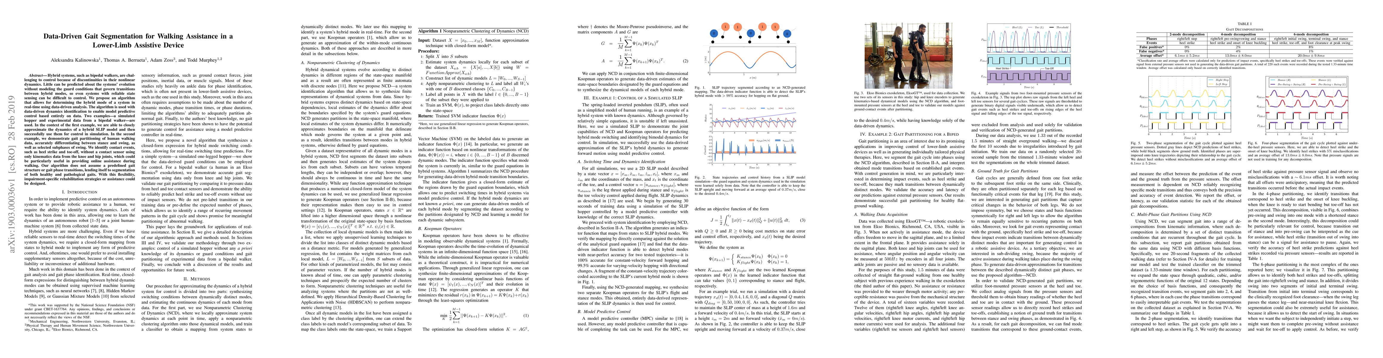 This paper proposes a data-driven gait segmentation algorithm for lower-limb assistive devices, enabling real-time hybrid mode determination and model predictive control without predefined gait structures. It demonstrates successful gait partitioning and contact event identification in both simulated and experimental bipedal walker data, offering potential for online assistance and rehabilitation strategies.