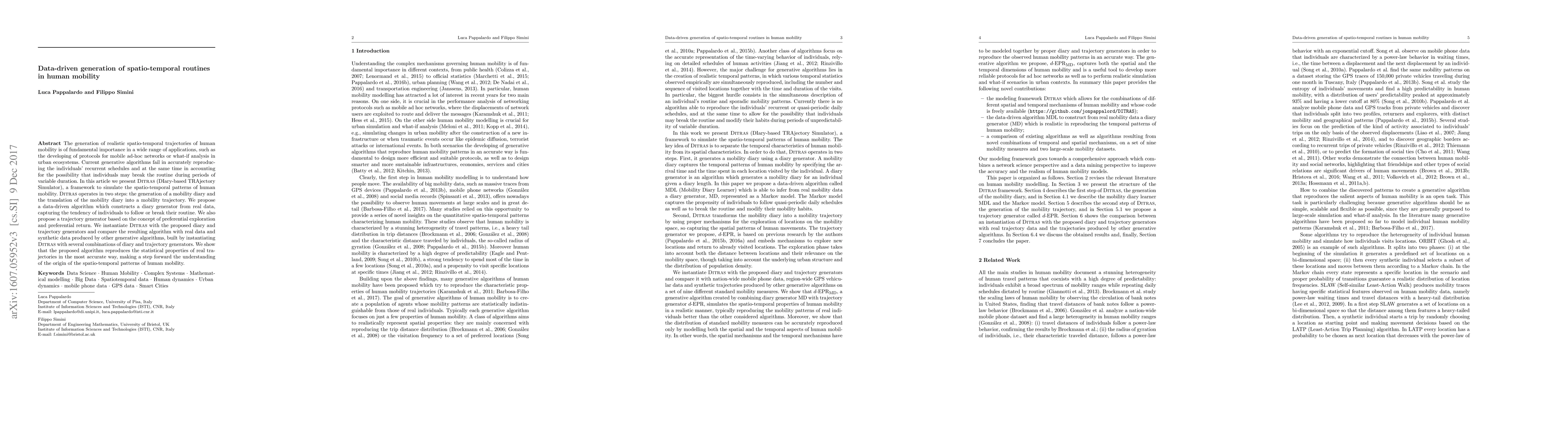 This paper introduces DITRAS, a framework for simulating human mobility patterns by generating realistic spatio-temporal trajectories. It combines a data-driven diary generator with a trajectory generator based on preferential exploration and return, outperforming other algorithms in accurately reproducing real mobility data.