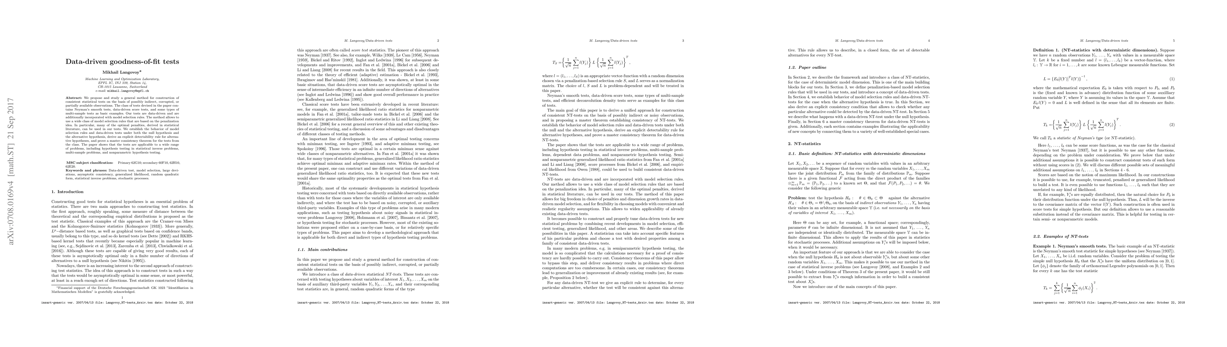 This paper introduces a data-driven method for constructing consistent statistical tests using indirect, corrupted, or partially available observations. The approach includes Neyman's smooth tests, data-driven score tests, and multi-sample tests, and is compatible with various model selection rules, including penalization-based methods. The research establishes test behavior under null and alternative hypotheses, provides a detectability rule, and proves a master consistency theorem. The method's applicability spans hypothesis testing in inverse problems, multi-sample problems, and nonparametric testing.