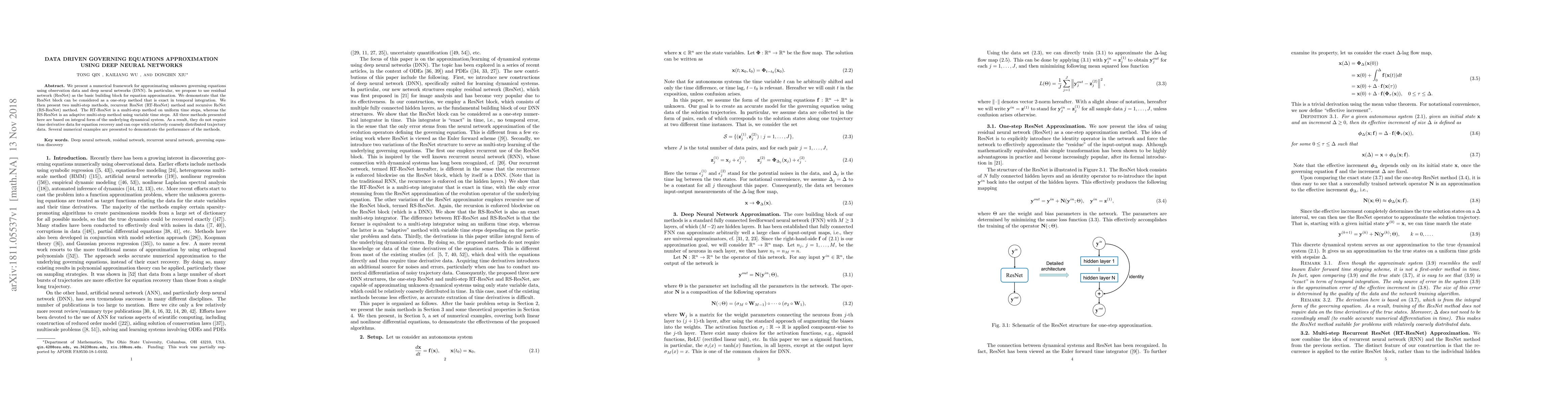 This paper proposes a framework for approximating unknown governing equations using deep neural networks, specifically ResNet blocks, and introduces two multi-step methods, RT-ResNet and RS-ResNet, to enhance accuracy. The methods are shown to work well with sparse observation data without requiring time derivative information.