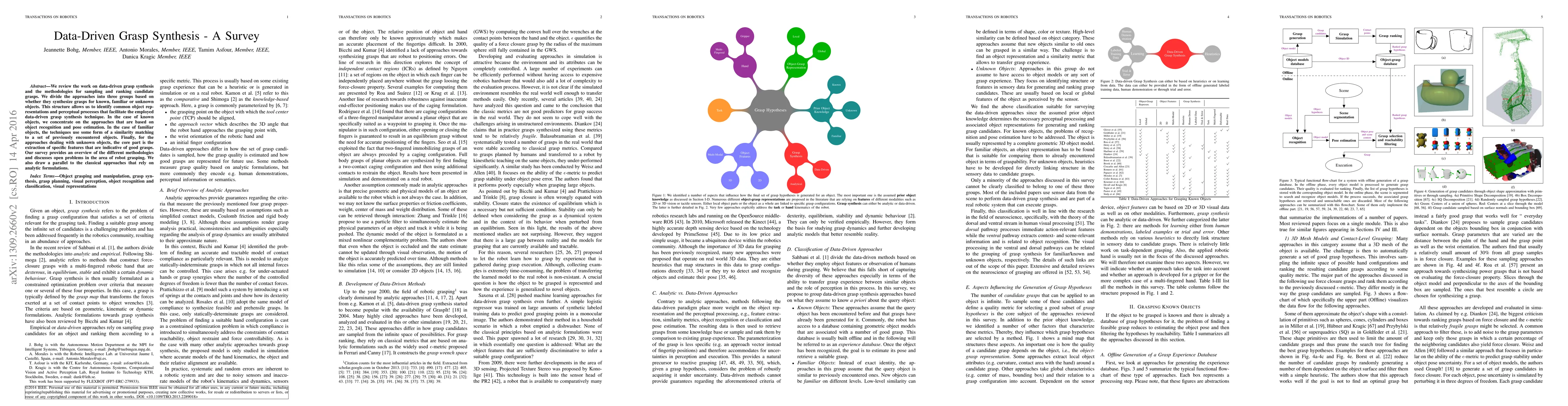 We review the work on data-driven grasp synthesis and the methodologies for sampling and ranking candidate grasps. We divide the approaches into three groups based on whether they synthesize grasps for known, familiar or unknown objects. This structure allows us to identify common object representations and perceptual processes that facilitate the employed data-driven grasp synthesis technique. In the case of known objects, we concentrate on the approaches that are based on object recognition and pose estimation. In the case of familiar objects, the techniques use some form of a similarity matching to a set of previously encountered objects. Finally for the approaches dealing with unknown objects, the core part is the extraction of specific features that are indicative of good grasps. Our survey provides an overview of the different methodologies and discusses open problems in the area of robot grasping. We also draw a parallel to the classical approaches that rely on analytic formulations.