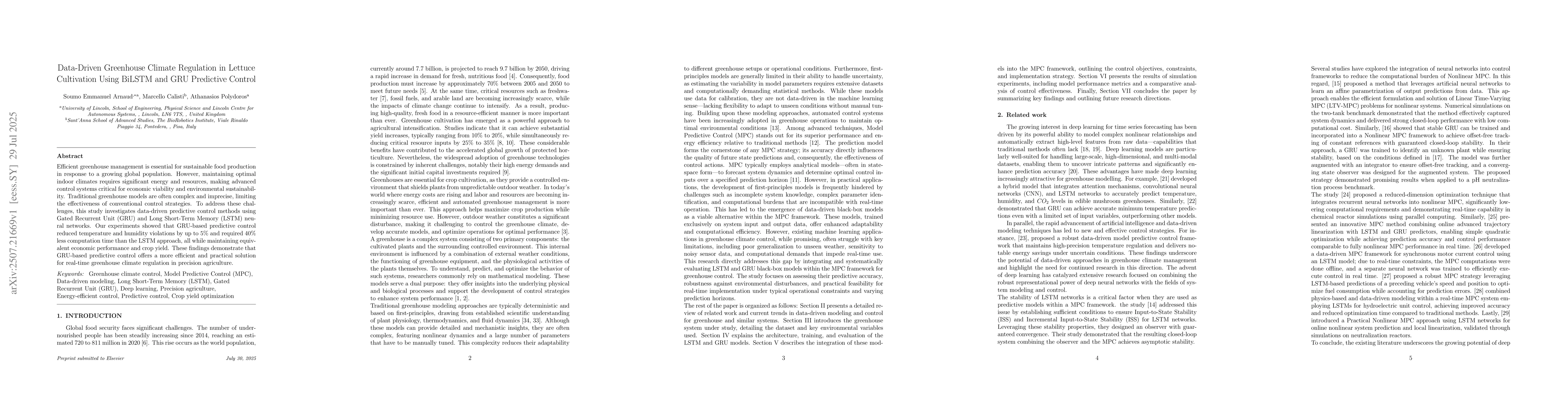 Efficient greenhouse management is essential for sustainable food production in response to a growing global population. However, maintaining optimal indoor climates requires significant energy and resources, making advanced control systems critical for economic viability and environmental sustainability. Traditional greenhouse models are often complex and imprecise, limiting the effectiveness of conventional control strategies. To address these challenges, this study investigates data-driven predictive control methods using Gated Recurrent Unit (GRU) and Long Short-Term Memory (LSTM) neural networks. Our experiments showed that GRU-based predictive control reduced temperature and humidity violations by up to 5\% and required 40\% less computation time than the LSTM approach, all while maintaining equivalent economic performance and crop yield. These findings demonstrate that GRU-based predictive control offers a more efficient and practical solution for real-time greenhouse climate regulation in precision agriculture.