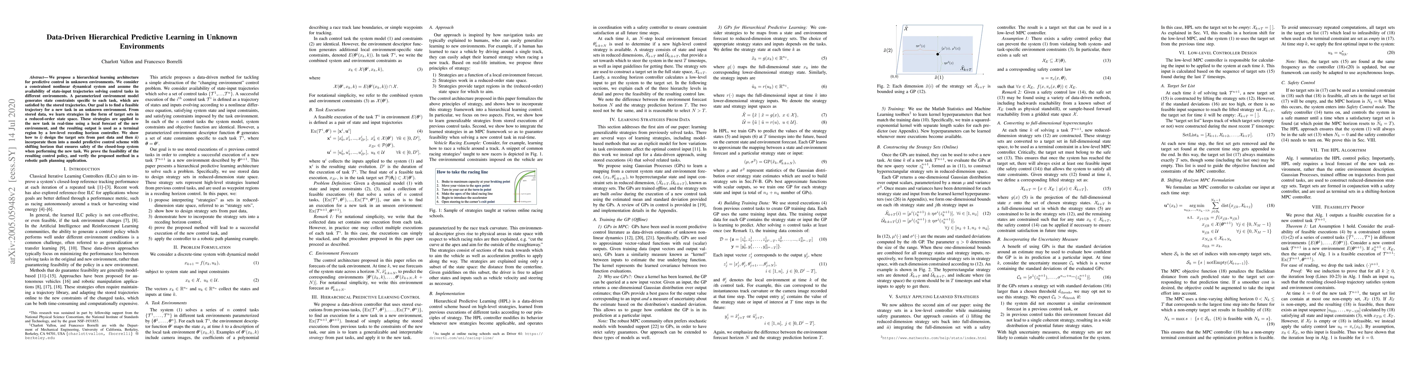 We propose a hierarchical learning architecture for predictive control in unknown environments. We consider a constrained nonlinear dynamical system and assume the availability of state-input trajectories solving control tasks in different environments. A parameterized environment model generates state constraints specific to each task, which are satisfied by the stored trajectories. Our goal is to find a feasible trajectory for a new task in an unknown environment. From stored data, we learn strategies in the form of target sets in a reduced-order state space. These strategies are applied to the new task in real-time using a local forecast of the new environment, and the resulting output is used as a terminal region by a low-level receding horizon controller. We show how to i) design the target sets from past data and then ii) incorporate them into a model predictive control scheme with shifting horizon that ensures safety of the closed-loop system when performing the new task. We prove the feasibility of the resulting control policy, and verify the proposed method in a robotic path planning application.