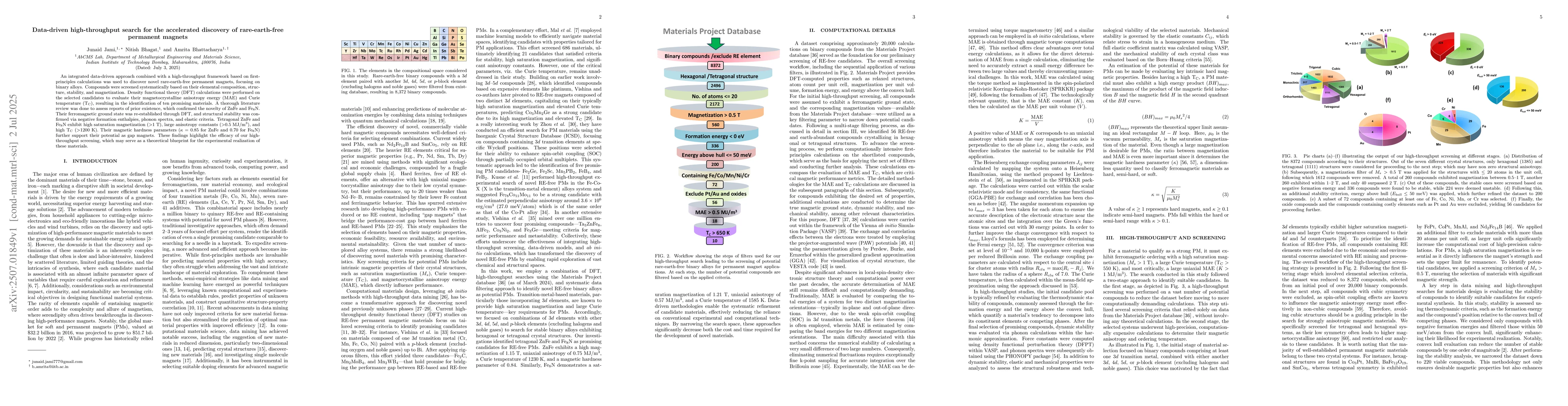 This research identifies ten promising rare-earth-free permanent magnets using a data-driven, high-throughput approach. The method combines first-principles calculations to screen binary alloys based on composition, structure, stability, and magnetization, ultimately proposing ZnFe and Fe8N as potential gap magnets with high saturation magnetization, large anisotropy constants, and high Curie temperatures.