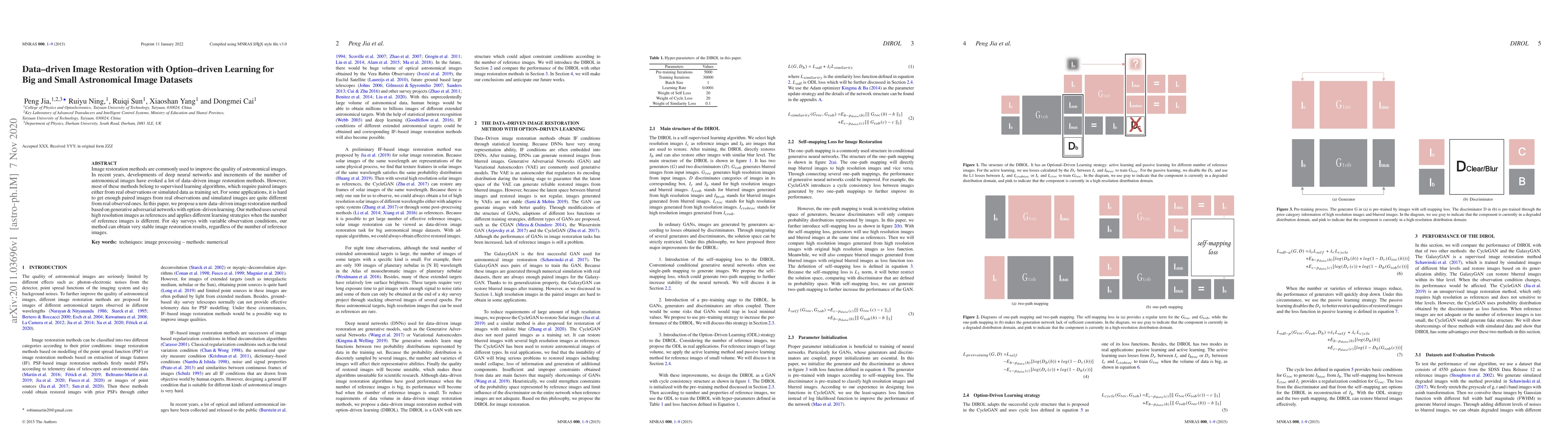 This paper proposes a data-driven image restoration method using generative adversarial networks with option-driven learning to improve astronomical images. It addresses the challenge of limited paired training data by employing different learning strategies based on the number of available high-resolution reference images, achieving stable results across various sky surveys.