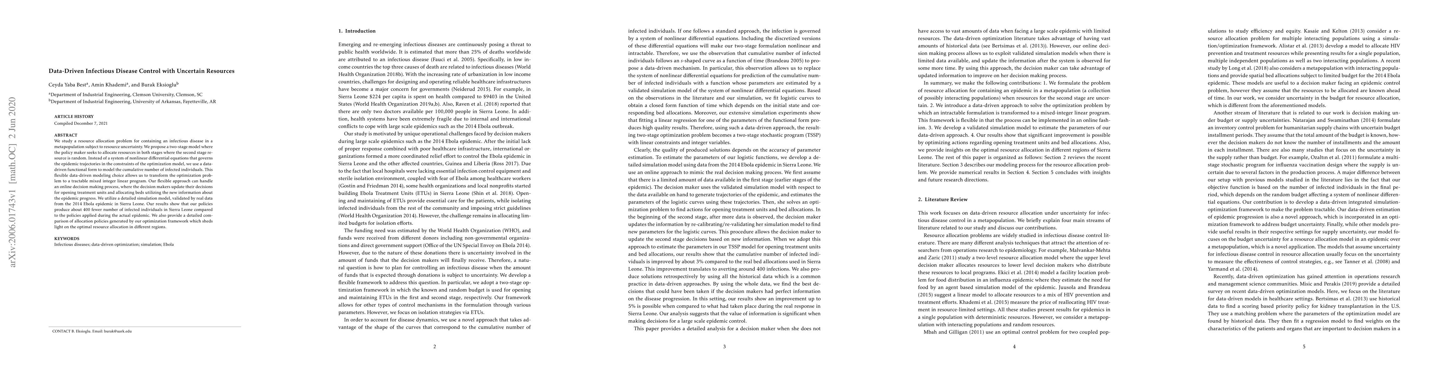 A new approach to controlling infectious diseases using data-driven modeling and optimization is proposed, showing a 400 fewer number of infected individuals compared to actual policies in Sierra Leone.