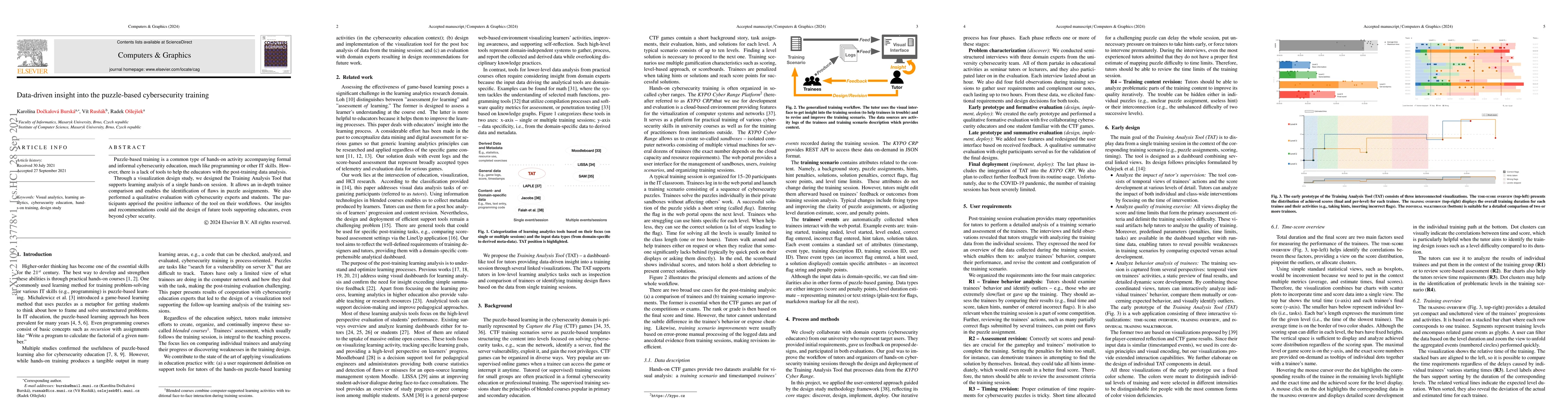 Puzzle-based training is a common type of hands-on activity accompanying formal and informal cybersecurity education, much like programming or other IT skills. However, there is a lack of tools to help the educators with the post-training data analysis. Through a visualization design study, we designed the Training Analysis Tool that supports learning analysis of a single hands-on session. It allows an in-depth trainee comparison and enables the identification of flaws in puzzle assignments. We also performed a qualitative evaluation with cybersecurity experts and students. The participants apprised the positive influence of the tool on their workflows. Our insights and recommendations could aid the design of future tools supporting educators, even beyond cyber security.