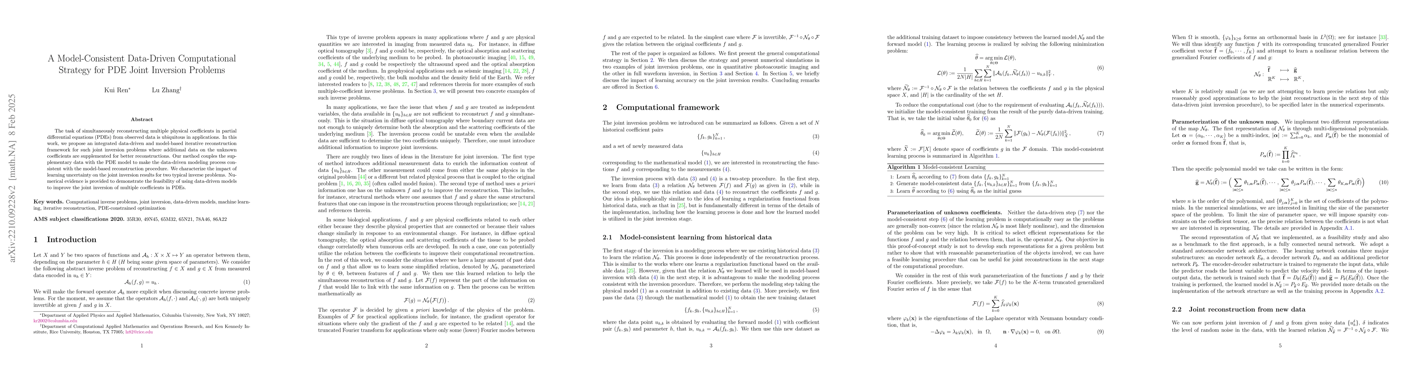 The task of simultaneously reconstructing multiple physical coefficients in partial differential equations from observed data is ubiquitous in applications. In this work, we propose an integrated data-driven and model-based iterative reconstruction framework for such joint inversion problems where additional data on the unknown coefficients are supplemented for better reconstructions. Our method couples the supplementary data with the PDE model to make the data-driven modeling process consistent with the model-based reconstruction procedure. We characterize the impact of learning uncertainty on the joint inversion results for two typical model inverse problems. Numerical evidences are provided to demonstrate the feasibility of using data-driven models to improve joint inversion of physical models.