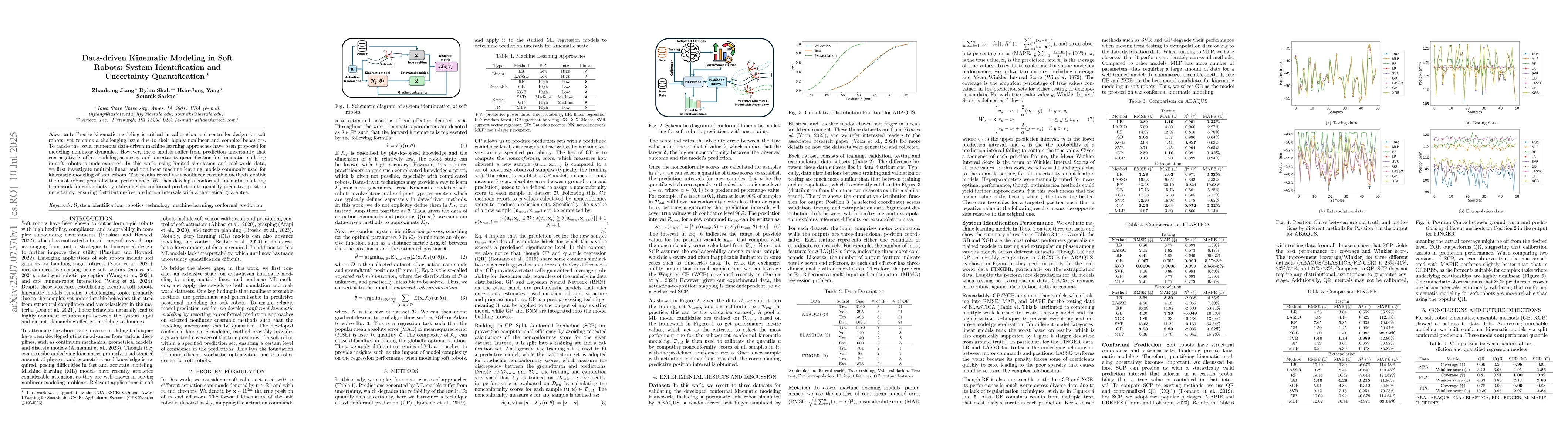 Precise kinematic modeling is critical in calibration and controller design for soft robots, yet remains a challenging issue due to their highly nonlinear and complex behaviors. To tackle the issue, numerous data-driven machine learning approaches have been proposed for modeling nonlinear dynamics. However, these models suffer from prediction uncertainty that can negatively affect modeling accuracy, and uncertainty quantification for kinematic modeling in soft robots is underexplored. In this work, using limited simulation and real-world data, we first investigate multiple linear and nonlinear machine learning models commonly used for kinematic modeling of soft robots. The results reveal that nonlinear ensemble methods exhibit the most robust generalization performance. We then develop a conformal kinematic modeling framework for soft robots by utilizing split conformal prediction to quantify predictive position uncertainty, ensuring distribution-free prediction intervals with a theoretical guarantee.