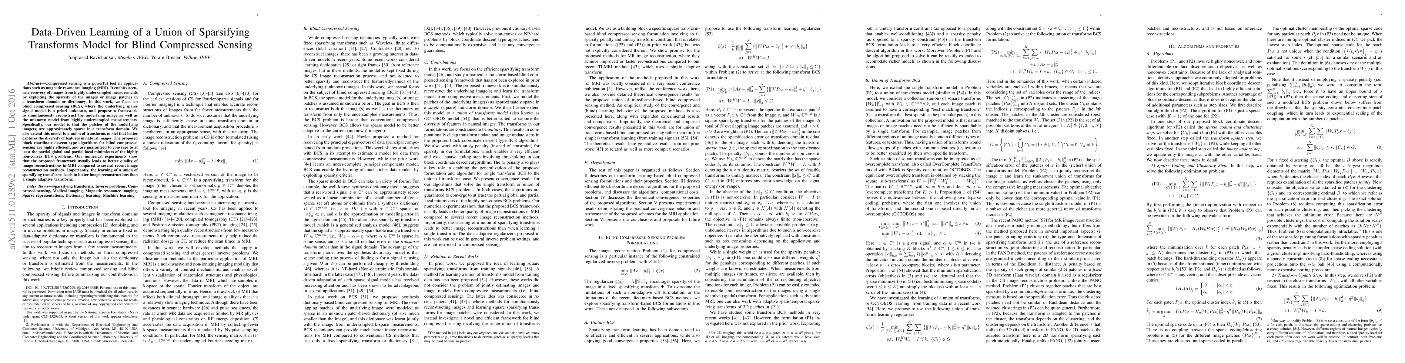 This paper proposes a data-driven learning framework for blind compressed sensing, where it reconstructs images and learns an unknown sparse signal model from undersampled measurements. The model uses a union of sparsifying transforms to better capture diverse image features, leading to improved MRI reconstruction quality compared to recent methods.