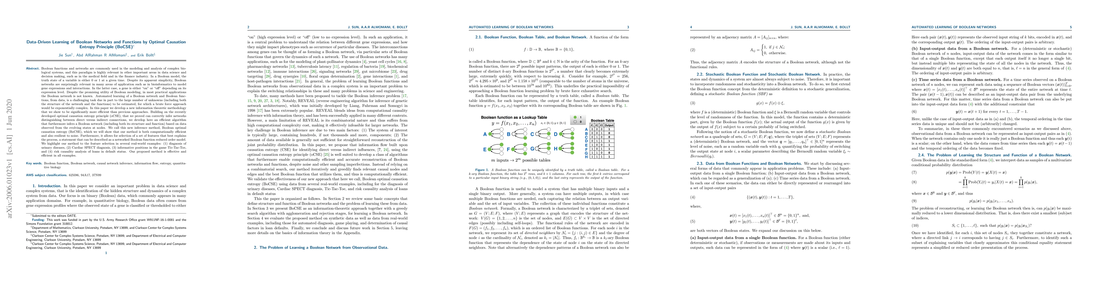 This paper introduces a new data-driven learning method called Boolean optimal causation entropy (BoCSE) for efficiently inferring Boolean networks and functions from data. The BoCSE method, based on the optimal causation entropy principle, is shown to be both computationally efficient and resilient to noise, effectively applied in various real-world scenarios including medical diagnosis and financial risk analysis.