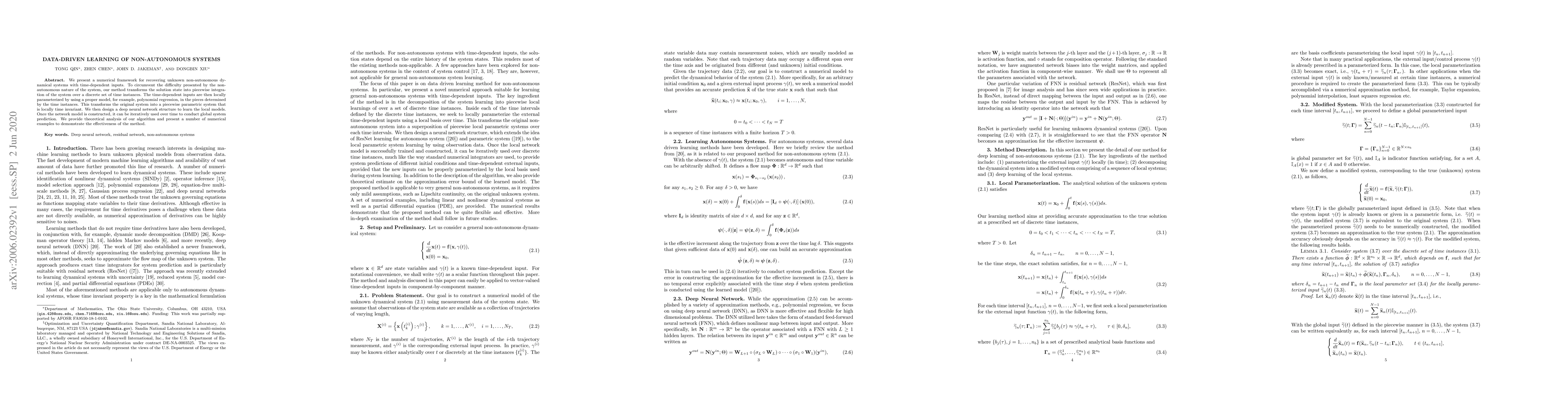 We present a numerical framework for recovering unknown non-autonomous dynamical systems with time-dependent inputs. To circumvent the difficulty presented by the non-autonomous nature of the system, our method transforms the solution state into piecewise integration of the system over a discrete set of time instances. The time-dependent inputs are then locally parameterized by using a proper model, for example, polynomial regression, in the pieces determined by the time instances. This transforms the original system into a piecewise parametric system that is locally time invariant. We then design a deep neural network structure to learn the local models. Once the network model is constructed, it can be iteratively used over time to conduct global system prediction. We provide theoretical analysis of our algorithm and present a number of numerical examples to demonstrate the effectiveness of the method.